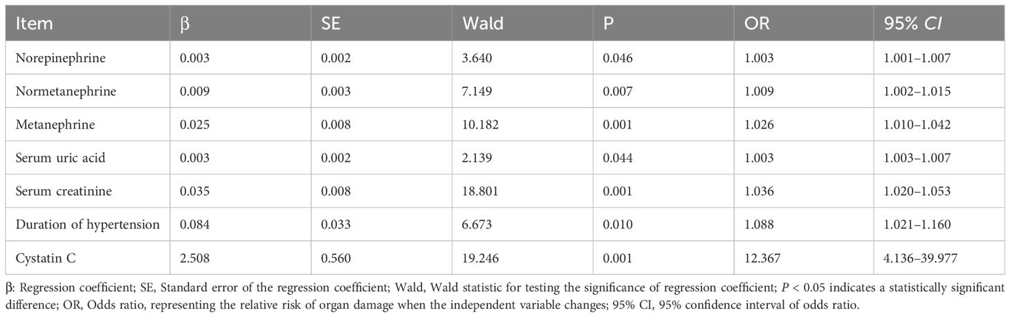 Multivariate logistic regression analysis of organ damage in hypertensive patients Organ damage (Yes = 1, No = 0) was set as the dependent variable, and covariates with P < 0.05 in univariate analysis were incorporated into the multivariate logistic regression model. The results demonstrated that norepinephrine (OR = 1.003, 95% CI: 1.001–1.007), normetanephrine (OR = 1.009, 95% CI: 1.002–1.015), metanephrine (OR = 1.026, 95% CI: 1.010–1.042), serum uric acid (OR = 1.003, 95% CI: 1.003–1.007), serum creatinine (OR = 1.036, 95% CI: 1.020–1.053), duration of hypertension (OR = 1.088, 95% CI: 1.021–1.160), and cystatin C (OR = 12.367, 95% CI: 4.136–39.977) were independent risk factors for organ damage in hypertensive patients (all P < 0.05) (Table 3).
