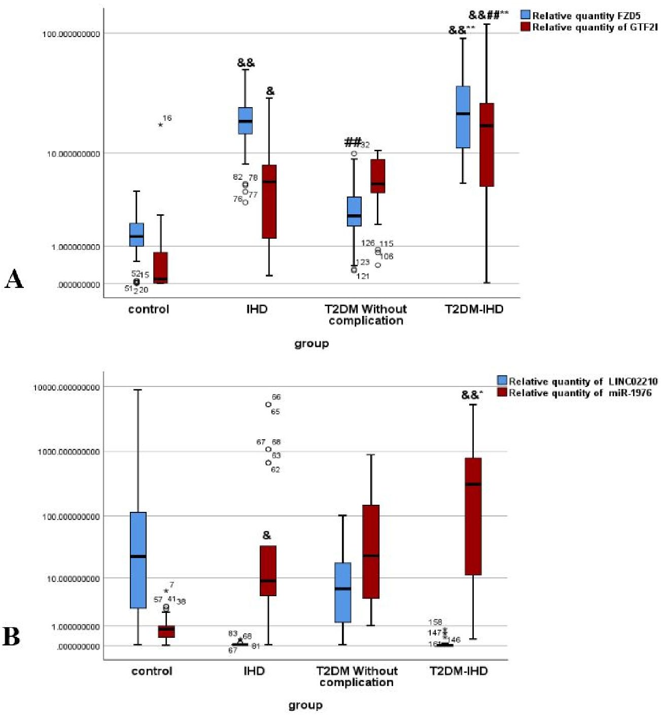 Box plots labeled A and B show data comparisons across groups: control, IHD, T2DM without complication, and T2DM-IHD. Plot A displays relative quantities of FZD5 and GTF2I, while plot B shows LINC02210 and miR-1976. Blue and red boxes represent different quantities, and various symbols indicate statistical significance.