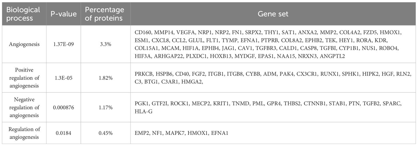 A total of 864 enriched Gene Ontology biological process (GO-BP) terms and 139 Reactome pathways were identified. Functional annotations of the common DEGs were enriched mainly in angiogenesis, hypoxia, platelet degranulation, and cell adhesion. The top eight terms for both GO-BP enrichment are presented in Supplementary Figure S2, according to the order of p value. In addition, three angiogenesis-related GO-BP terms with high protein percentages were among the most significant results. Consequently, the GO-BP analysis was utilized to retrieve the gene sets related to angiogenesis to investigate its role in progression of both diseases (Table 1).