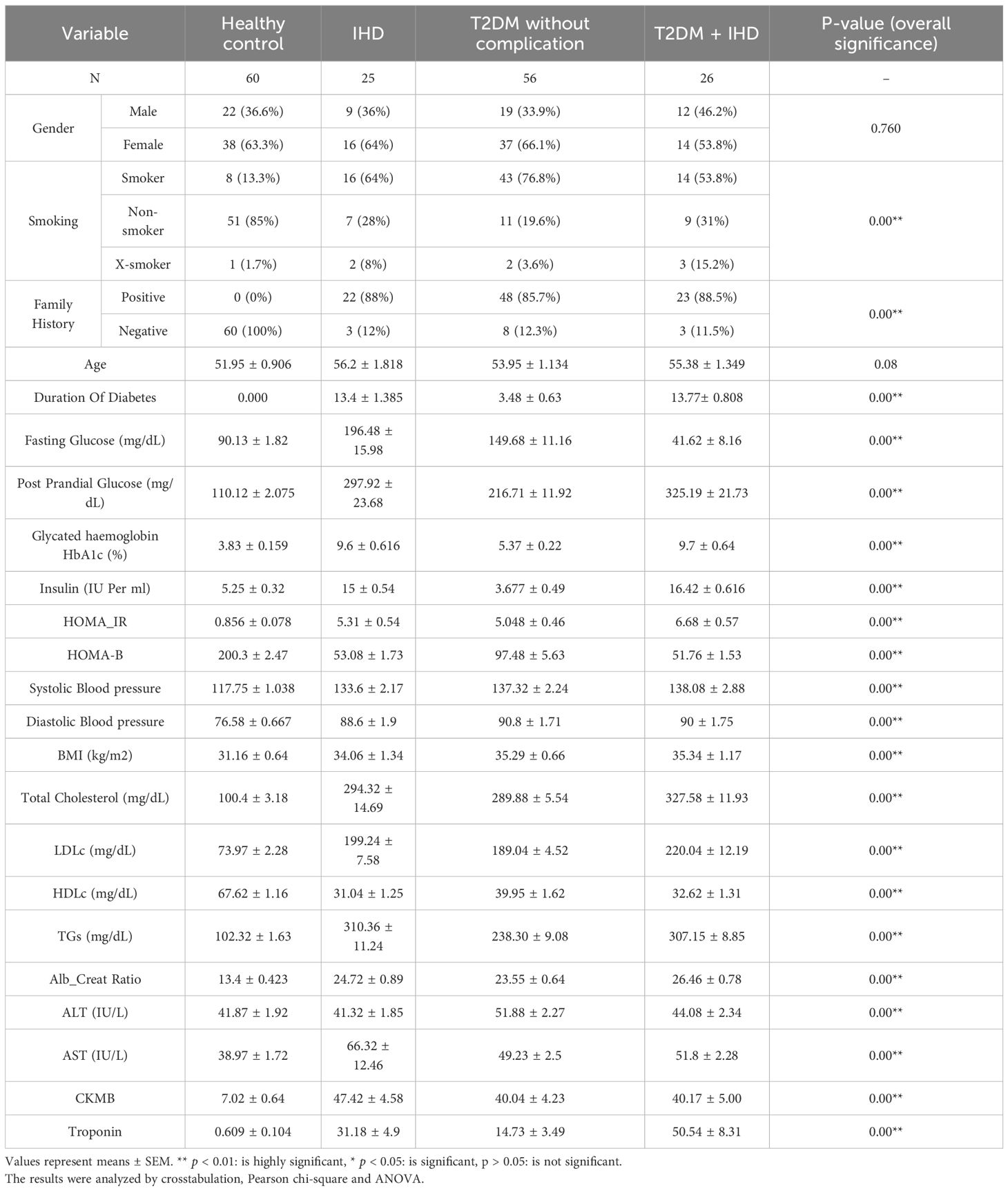 The cohort comprised 167 participants allocated to four groups: 60 healthy controls; 25 individuals with IHD; 56 patients meeting ADA criteria for T2DM without cardiovascular disease; and 26 patients meeting ADA criteria for T2DM with cardiovascular disease. Age and sex did not differ significantly across groups (p ≥ 0.05). By contrast, the groups differed significantly in smoking status and family history of T2DM (p < 0.001); in fasting and 2-h postprandial glucose (p < 0.001); in HbA1c and fasting insulin (p < 0.001); in HOMA-IR, HOMA-B, and BMI (p < 0.001); in systolic/diastolic blood pressure, ALT, AST, CK-MB, and troponin (p < 0.001); in the lipid profile—total cholesterol, LDL-C, HDL-C, triglycerides (p < 0.001); and in the urine albumin to creatinine ratio (p < 0.001), as detailed in Table 2.