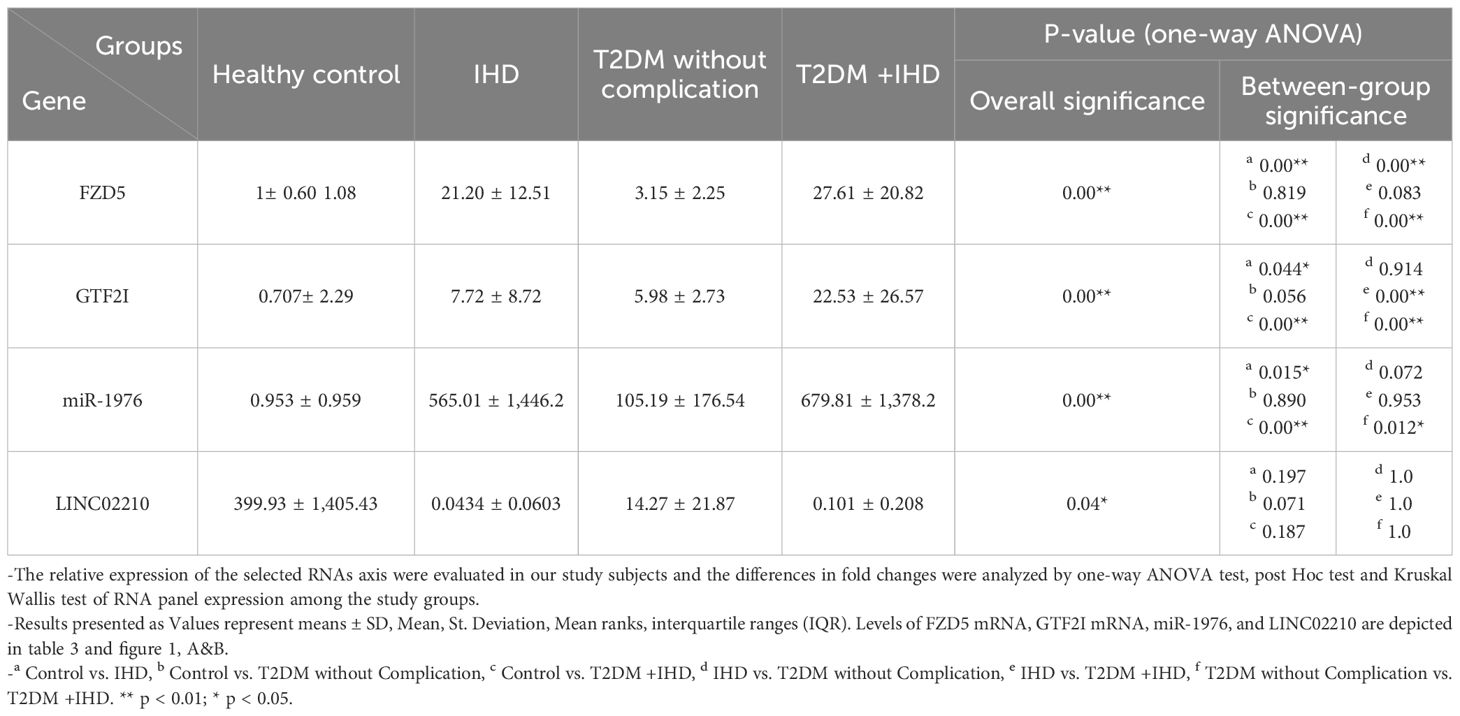 We assessed differential expression of the selected RNA panel across study groups using fold-change analysis. Relative to controls, expression of panel members other than LINC02210 including FZD5, GTF2I, and hsa-miR-1976 increased stepwise from controls to T2DM (without complications) and IHD, with the highest levels in T2DM+IHD (p < 0.001). By contrast, LINC02210 showed a progressive decrease from controls → T2DM (without complications) → T2DM+IHD, reaching its lowest abundance in IHD (p < 0.001). Consistent with these trajectories, FZD5, GTF2I, and hsa-miR-1976 were significantly upregulated in IHD, T2DM without complications, and T2DM+IHD versus healthy controls, whereas the overall reduction in LINC02210 across groups did not reach statistical significance (P > 0.05), as summarized in Table 3.