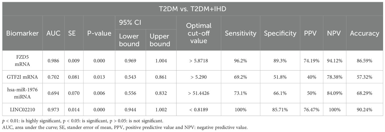 In the IHD vs T2DM comparison, FZD5 mRNA (AUC 0.966) and LINC02210 (AUC 0.978) achieved clear discrimination. The corresponding optimal cutoff values were 4.2156 and 0.2753, yielding sensitivities of 96.0% and 100% and specificities of 76.8% and 96.4%, respectively. By contrast, GTF2I mRNA and hsa-miR-1976 did not discriminate between IHD from T2DM, reflecting lower AUCs and suboptimal operating characteristics (Table 4, Figures 2C, D).