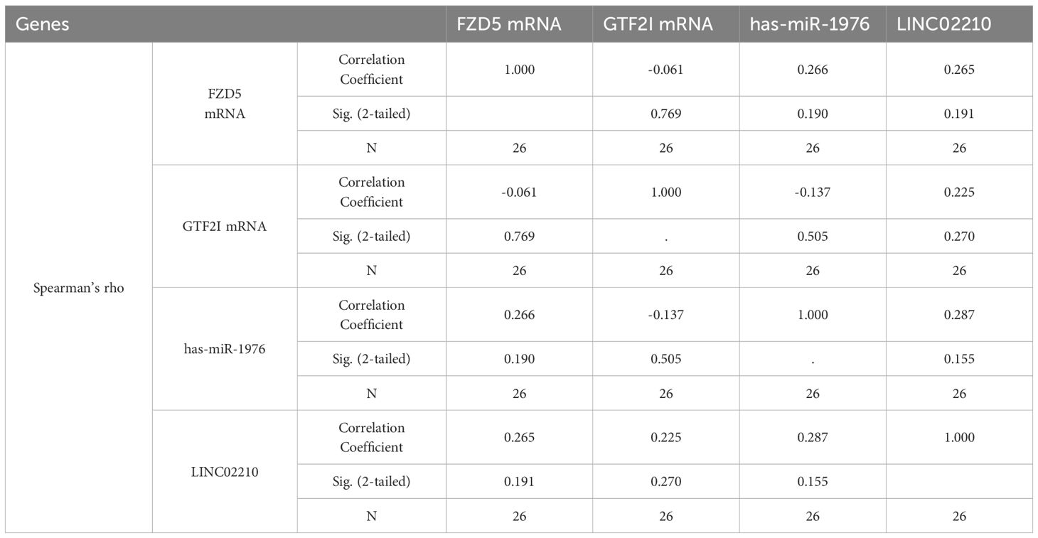 mRNA targets (FZD5, GTF2I) were quantified using gene-specific primer assays in combination with the QuantiTect Multiplex PCR Kit (Qiagen, Hilden, Germany, cat. no. 249900; assay IDs QT00200886 and QT01677305), with GAPDH and ACTB serving as internal references. For miRNA measurements, hsa-miR-1976 was amplified with the miRCURY LNA SYBR Green PCR Kit (Qiagen, cat. no. 339345) and the corresponding assay (Cat. No. 339350; ID: ZP00000388), and expression was normalized to SNORD44. LINC02210 (lncRNA) levels were determined using the RT2 lncRNA qPCR Assay (Qiagen, cat. no. 330701), with GAPDH as the reference control. Thermal cycling conditions were 95 °C for 2 min, followed by 45 cycles of 95 °C for 5 s and 60 °C for 10 s. Relative expression was computed by the Livak method (RQ = 2^−ΔΔCt) (37), and reactions were run on an Applied Biosystems 7500 Fast System (37). All primer assays utilized in this study were sourced from Qiagen, Germany (Supplementary Table S3).