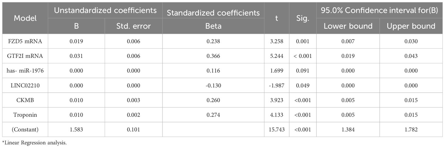 A linear regression analysis was used to evaluate the relationships between RNAs levels across all study groups. FZD5 mRNA (p = 0.001), GTF2I mRNA (p < 0.001), LINC02210 (p = 0.049), CK-MB (p < 0.001) and Troponin (p < 0.001) were significant predictor, whereas has-miR-1976 (p = 0.091) was not significant in the combined analysis (Table 8).