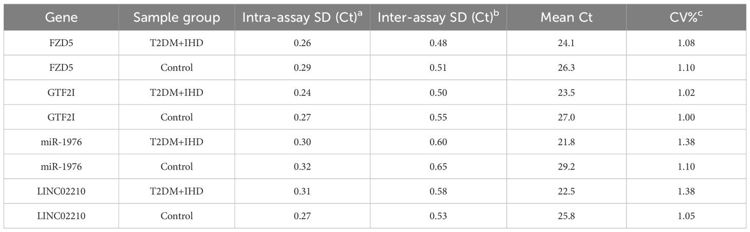 GTF2I showed a lower mean Ct in T2DM+IHD (23.5 vs 27.0 in controls), suggesting upregulated expression with intra-assay reproducibility (SD ≤0.27). hsa-miR-1976 showed markedly lower Ct in T2DM+IHD (21.8 vs 29.2 in controls), indicating strong differential expression with slightly higher inter-assay variability (SD = 0.60–0.65), potentially reflecting miRNA stability constraints. Across all targets, technical reproducibility was high with intra-assay CV% <1.4% and inter-assay CV% <1.5% (Table 9). has-miR-1976 exhibited the largest fold-change between groups (ΔCt = 7.4), aligning with its proposed role in metabolic regulation (Supplementary Table S1).