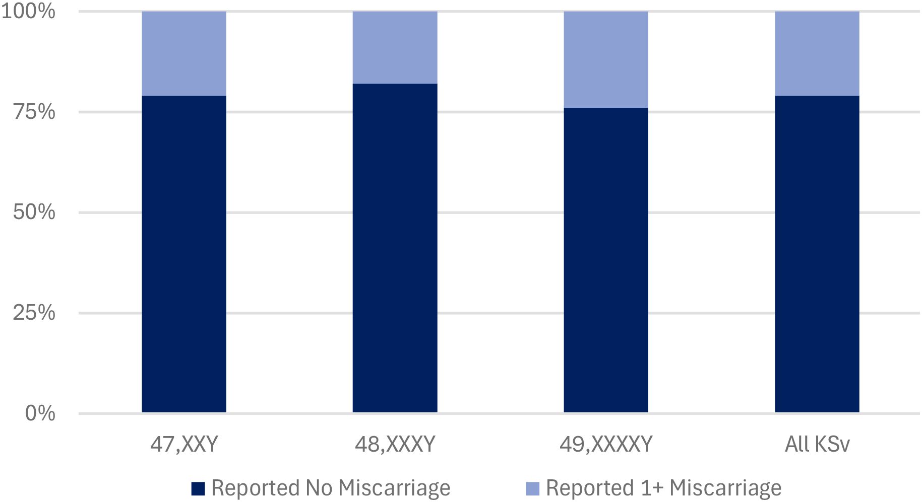 Figure 1. Reported miscarriage proportions of mothers of male offspring with KSc. Mothers are organized by KSc. The percentage of mothers who did not report miscarriage is represented in dark blue. The percentage of mothers who reported one or more miscarriages is represented in light blue.