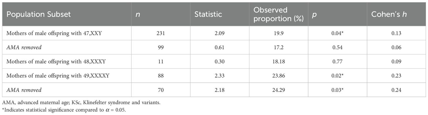 Statistical analyses were completed in jamovi software version 2.6 (14). Descriptive statistics were performed to identify the percentage of clinical miscarriages and incidences of RPL within each cohort and across all groups (KSc). Independent sample t-tests were used to determine whether there was a significant difference between the average maternal age of mothers with 47,XXY (KS) who reported a history of miscarriage and those who did not report miscarriage within each group. Independent sample t-tests were also used to explore whether there was a significant difference in the average maternal age of mothers who reported a history of one miscarriage and those reported RPL within each group. Chi-square tests of independence were used to examine whether there was an association between maternal age at the time of birth and reported miscarriage within each of the three groups. One-sample tests of proportions were used to evaluate whether there was a significant difference in the proportions of mothers in the KSc group who reported miscarriage versus the proportion of mothers in the general population who reported miscarriage. All p-values were compared to alpha = 0.05.