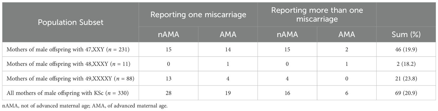 In the cohort of women who had a child with 47,XXY, 19.9% (n = 46) reported a history of miscarriages. Of those with a reported history of miscarriage, 63.0% (n = 29) of women reported having only one miscarriage, and 48.3% (n = 14) were of advanced maternal age (AMA). Of the original sample, 7.35% (n = 17) experienced RPL. Of those reporting RPL, 88.2% (n = 15) were of AMA.