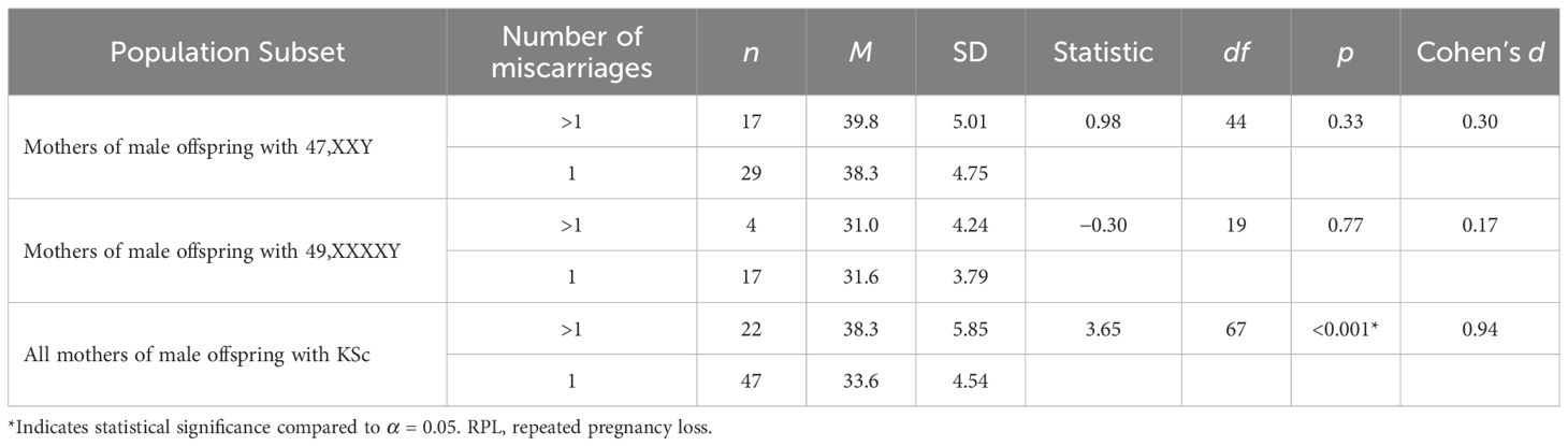 The mean age of the mothers with male offspring with 47,XXY who reported a history of miscarriage ( = 36.46) was significantly higher than those in the cohort who did not report miscarriage ( = 34.82), t(229) = 1.87, p = 0.03, d = 0.31. The mean age of the mothers in this group who reported a history of one miscarriage ( = 38.3) was not significantly different than those in this cohort who reported RPL ( = 39.8), t(44) = 0.983, p = 0.33, d = 0.30 (Table 1).