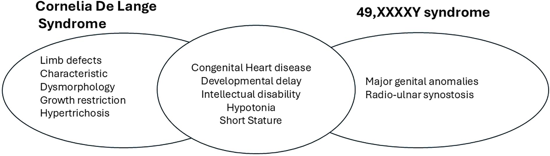 49,XXXXY syndrome is a rare chromosomal aneuploidy with an incidence of approximately 1 in 85,000–100,000 male births. It is characterized by moderate to severe intellectual disability, hypogonadism, facial dysmorphism, and skeletal anomalies. Cornelia de Lange syndrome (CdLS) is a distinct rare genetic condition with a prevalence of 1 in 10,000–30,000 live births. Most cases (80%) are sporadic autosomal dominant events caused by pathogenic variants in the NIPBL gene. However, rare cases can occur in the X-linked genes SMC1A and HDAC8. Clinical manifestations of CdLS include distinctive facial abnormalities, limb and cardiac malformations, growth retardation, and intellectual disability.