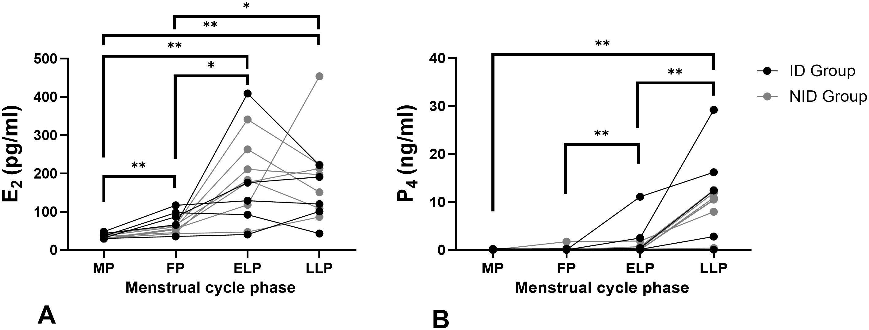 Figure 1. Changes in E2 and P4 during the menstrual cycle. (A) Changes in E2 concentrations and (B) changes in P4 concentrations. The asterisks indicate the results of one-way ANOVA with post hoc tests (*p < 0.05, **p < 0.001). Each line represents individual values (n = 12). Black indicating the iron-deficiency (ID) group and gray indicating the non–iron-deficiency (NID) group. E2: 17β-estradiol; P4: Pregn-4-ene-3,20-dione. MP, Menstrual phase; FP, Follicular phase; ELP, Early luteal phase; LLP, Late luteal phase.