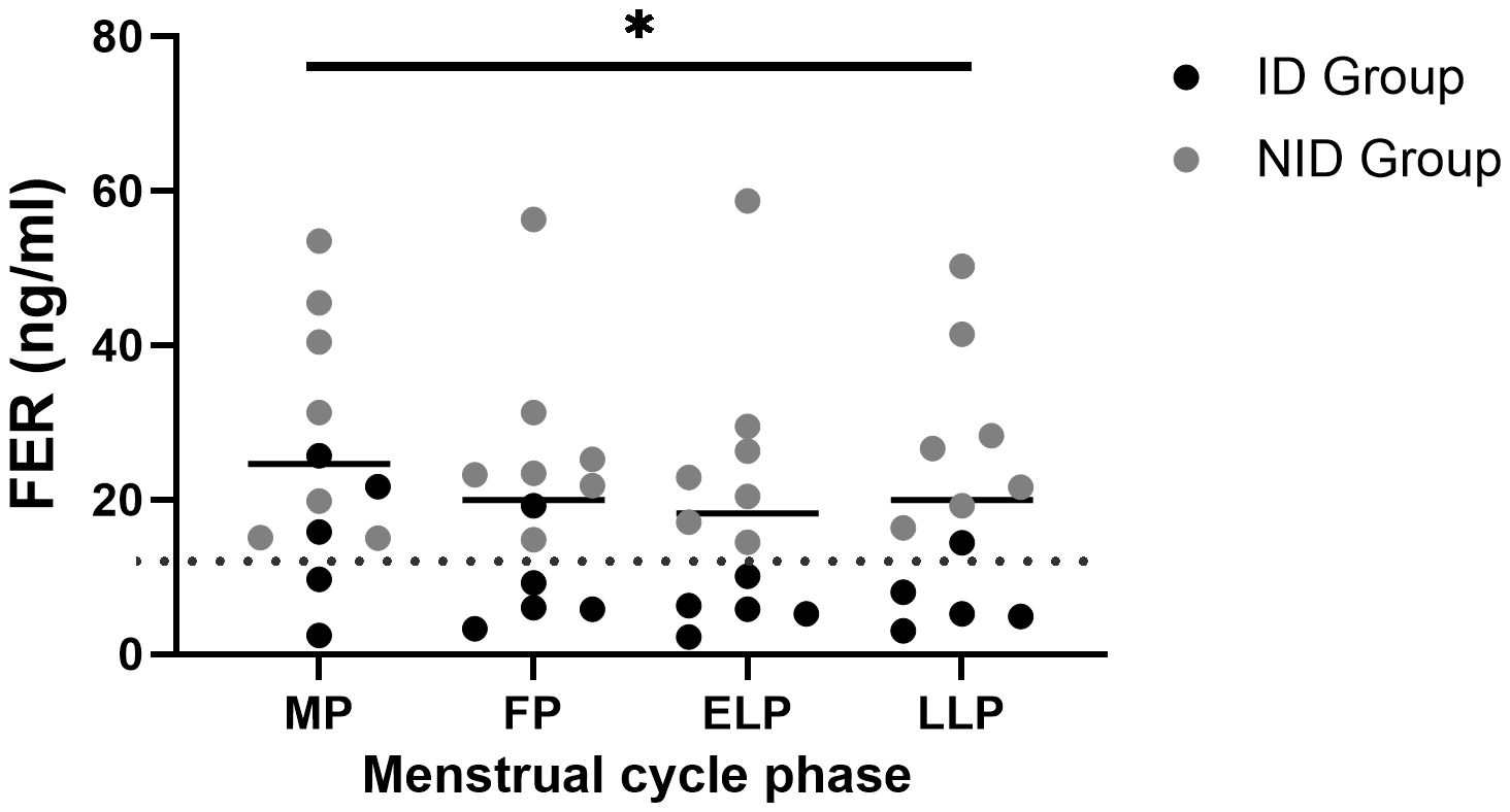 Figure 2. Fluctuations in FER during the menstrual cycle. The asterisk indicates the results of one-way ANOVA (*p < 0.05). Black dots indicate the iron-deficiency (ID) group, and gray dots indicate the non–iron-deficiency (NID) group. Horizontal bars indicate mean values (n = 12). MP, Menstrual phase; FP, Follicular phase; ELP, Early luteal phase; LLP, Late luteal phase; FER, Serum ferritin.