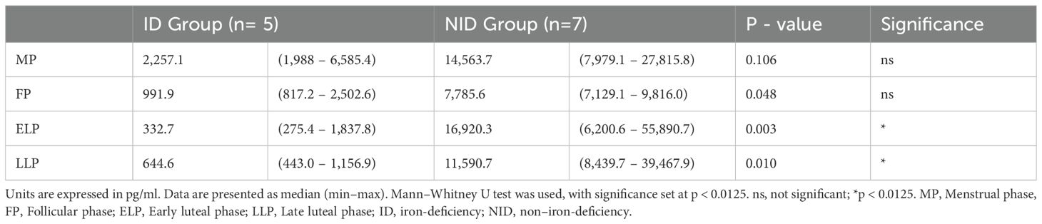 Exploratory subgroup analyses using two-way repeated-measures ANOVA revealed a significant group × menstrual cycle interaction (p = 0.04). Post hoc comparisons revealed that the ID group had significantly higher values than the NID group in the MP (p = 0.017). Similarly, in the FP, the ID group showed significantly higher values than the NID group (p = 0.047).