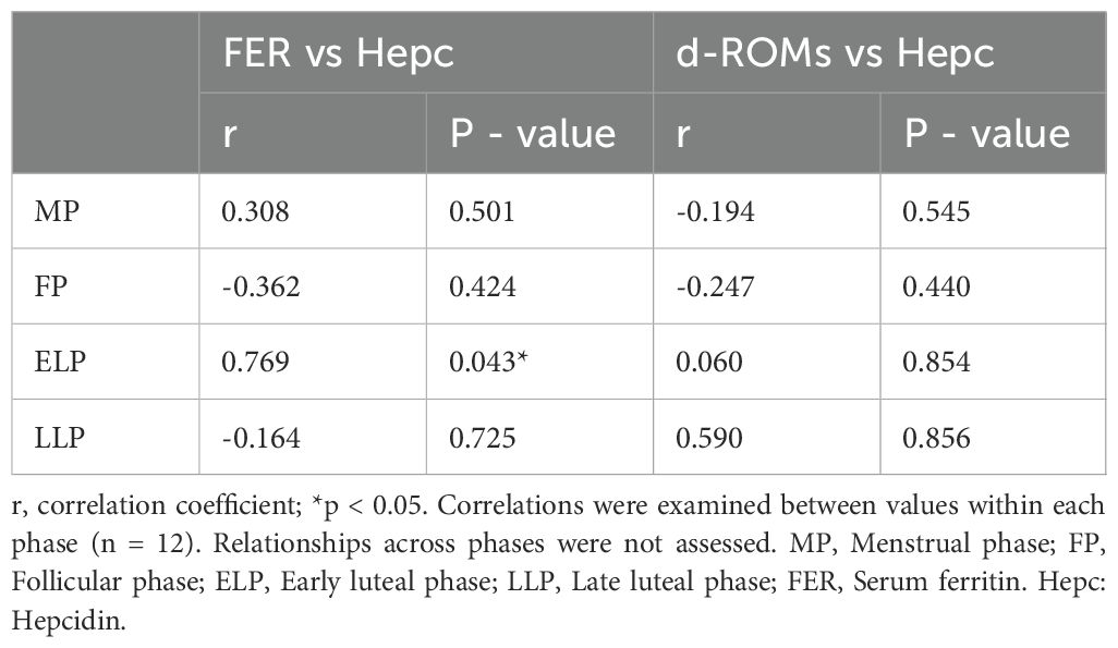 Table 2 shows the correlations between FER and Hepc, as well as between d-ROMs and Hepc, in each phase. A significant positive correlation between FER and Hepc was observed in the ELP (r = 0.769, p = 0.043), but not in the other phases. No significant correlations were observed between d-ROMs and Hepc in any phase (Table 2).