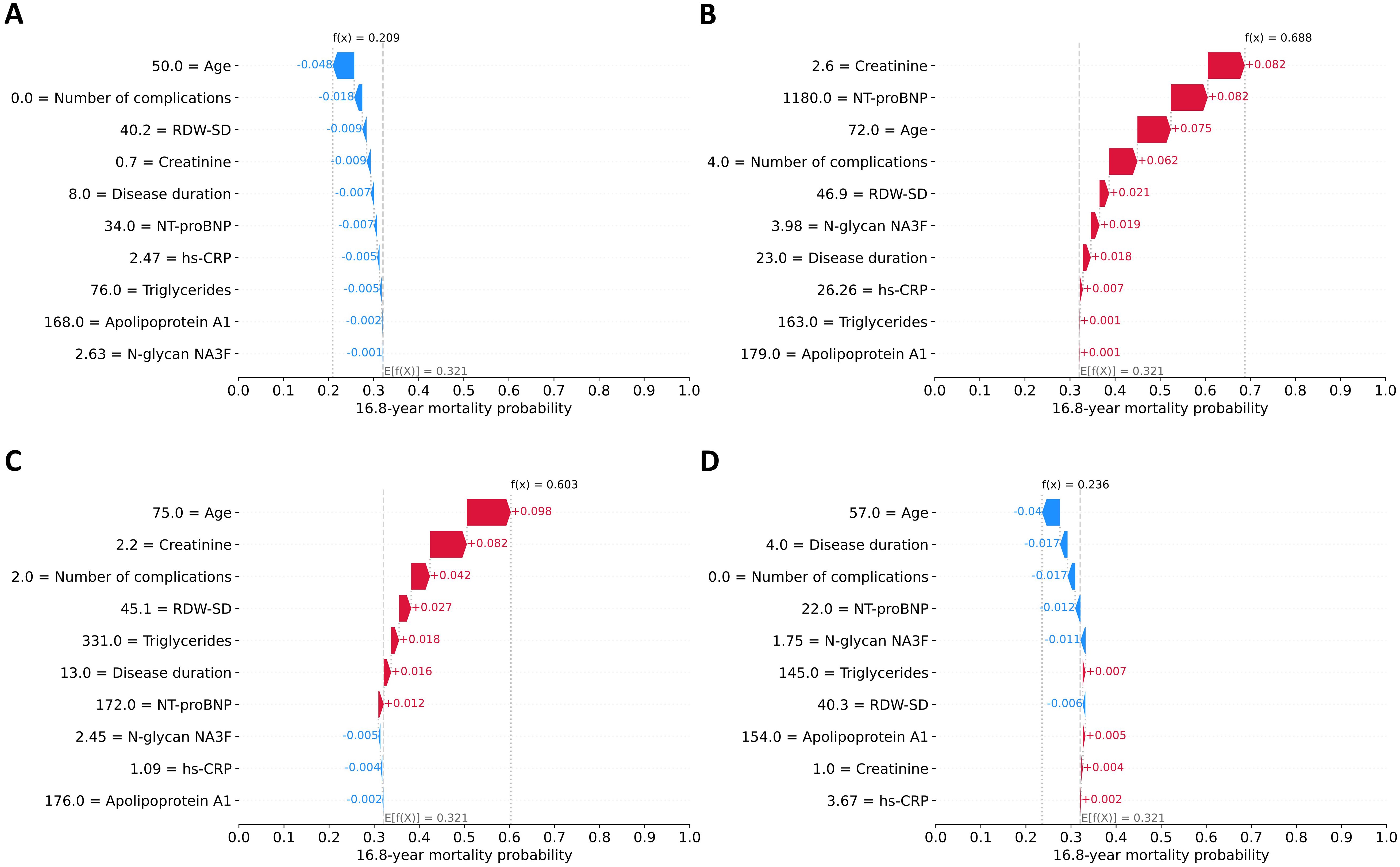Figure 4. Local explanation of individual predictions using SHAP waterfall plots. Four representative cases are shown. (A) A survivor (alive after 16.8 years) with low predicted mortality risk (20.9%), (B) a deceased patient (death occurring 4.4 years post-examination) with high predicted risk (68.8%), (C) a survivor with high predicted risk (60.3%), (D) a deceased patient (death occurring 10.6 years post-examination) with low predicted risk (23.6%). The y-axis displays features ranked by their increasing predictive influence from bottom to top. Feature values are presented in their original scale for interpretability, though the model utilized normalized values internally. The x-axis represents the 16.8-year mortality probability. The prediction originates from the baseline probability E[f(X)] derived from the training set and subsequently modifies based on each feature's contribution. Each colored bar illustrates a feature's directional effect on the model's output: blue bars signify protective (risk-reducing) factors, while red bars denote hazardous (risk-increasing) factors.