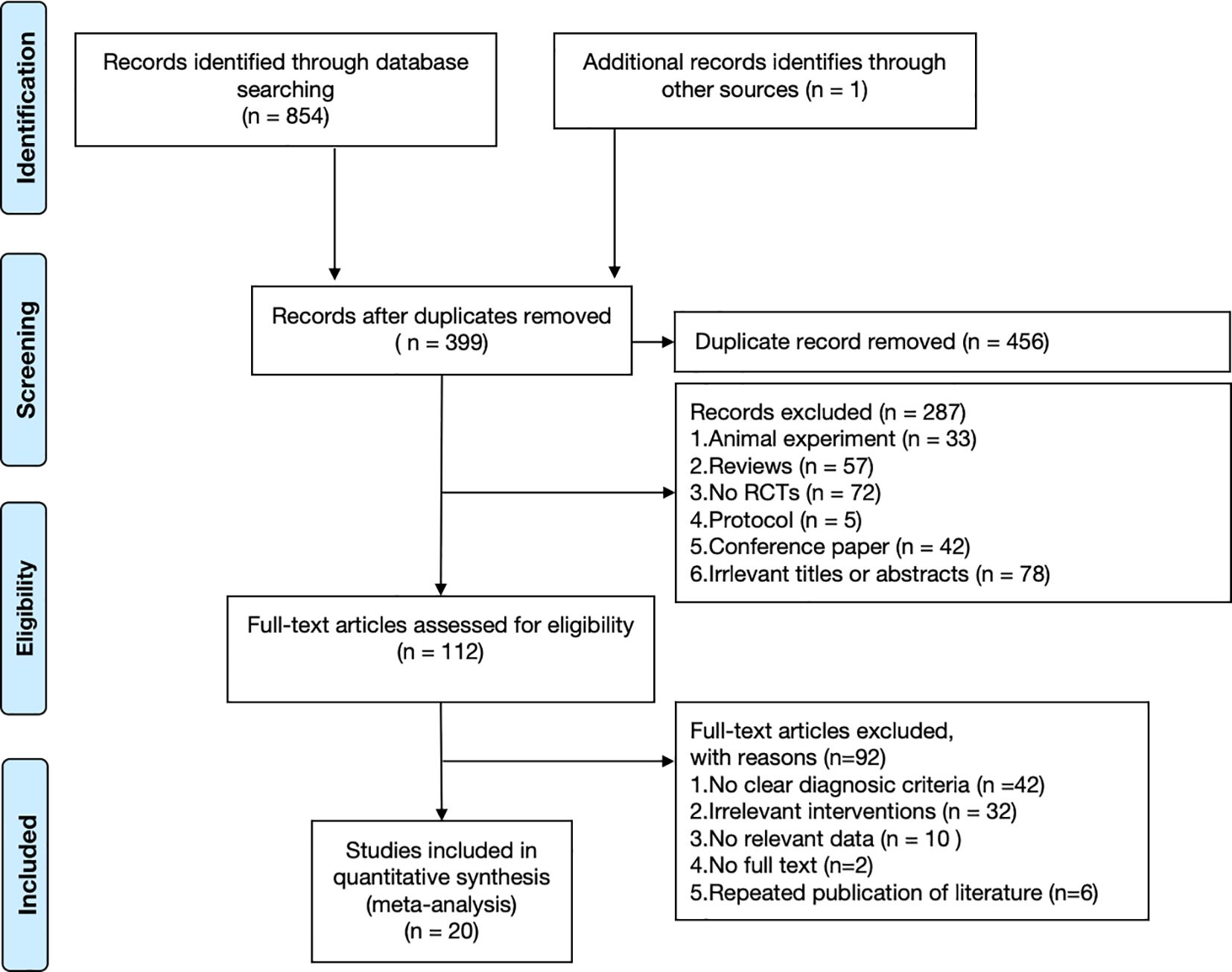 A total of 855 relevant studies were initially retrieved. After removing duplicates, 399 records remained for title and abstract screening. After screening titles and abstracts, 287 records were excluded. Subsequently, 112 full-text articles were assessed for eligibility, and 92 were excluded for not meeting the inclusion criteria. Ultimately, 20 RCTs were included in the present meta-analysis (26–45). The literature screening process and results are presented in Figure 1.
