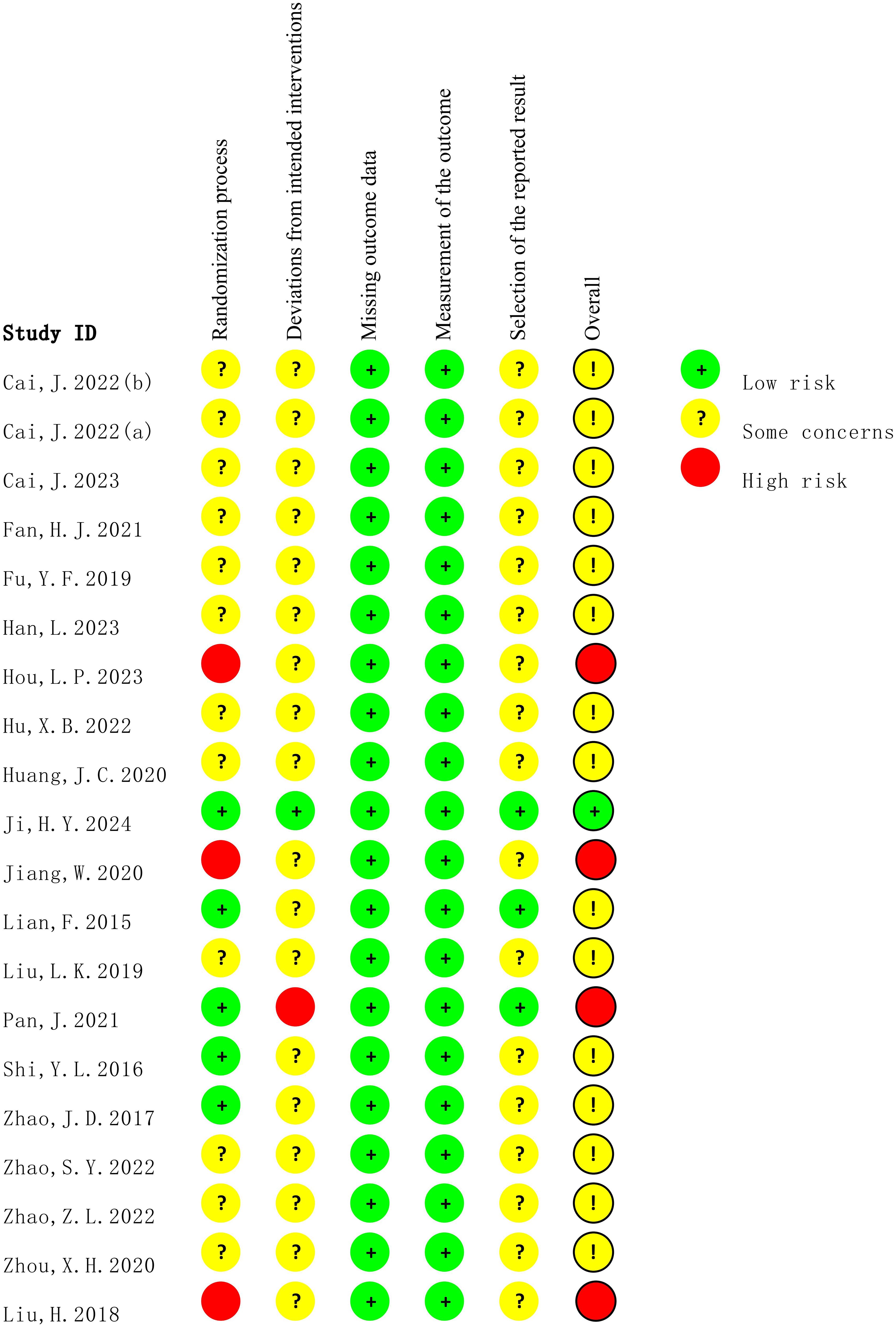 The methodological quality of all included studies was assessed using the ROB 2.0. As shown in Figure 2 and Figure 3, most studies reported randomization procedures but were rated as having “some concerns” in the domain of Randomization process due to insufficient description of allocation concealment. Three studies (32, 34, 35) were judged to be at “high risk” in this domain. In the domain of deviations from intended interventions, although most studies did not explicitly apply intention-to-treat (ITT) analysis, the proportion of participants who did not adhere to their assigned interventions was less than 5%, which was unlikely to substantially affect the results; therefore, these studies were rated as “low risk” or “some concerns.” However, the study by Pan, J (29). relied on per-protocol (PP) analysis rather than ITT, with a dropout rate of 12.7%, which may have introduced bias, and was thus rated as “high risk.” For outcome measurement, all studies were rated as “low risk,” since the primary outcomes were objectively measured using standardized blood glucose tests. In the domain of selection of the reported result, most studies were judged as having “some concerns,” primarily because they did not clarify whether a pre-specified analysis plan was finalized before unblinding. Overall, most studies were judged to have “some concerns,” and four studies were rated as “high risk” in at least one domain.