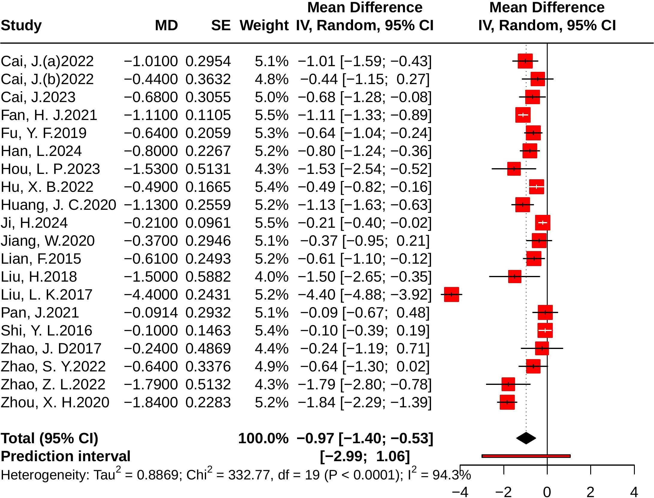 A total of 20 studies with 2,993 participants (1,497 in the control group and 1,496 in the treatment group) evaluated the effect of JLD on FBG. Heterogeneity analysis indicated substantial variability among studies (P < 0.001, I² = 94.3%, 95% PI [-2.99, 1.06]). The pooled results showed that JLD significantly reduced FBG compared with the control group (MD = –0.97, 95% CI: –1.40 to –0.53; p < 0.001; Figure 4).