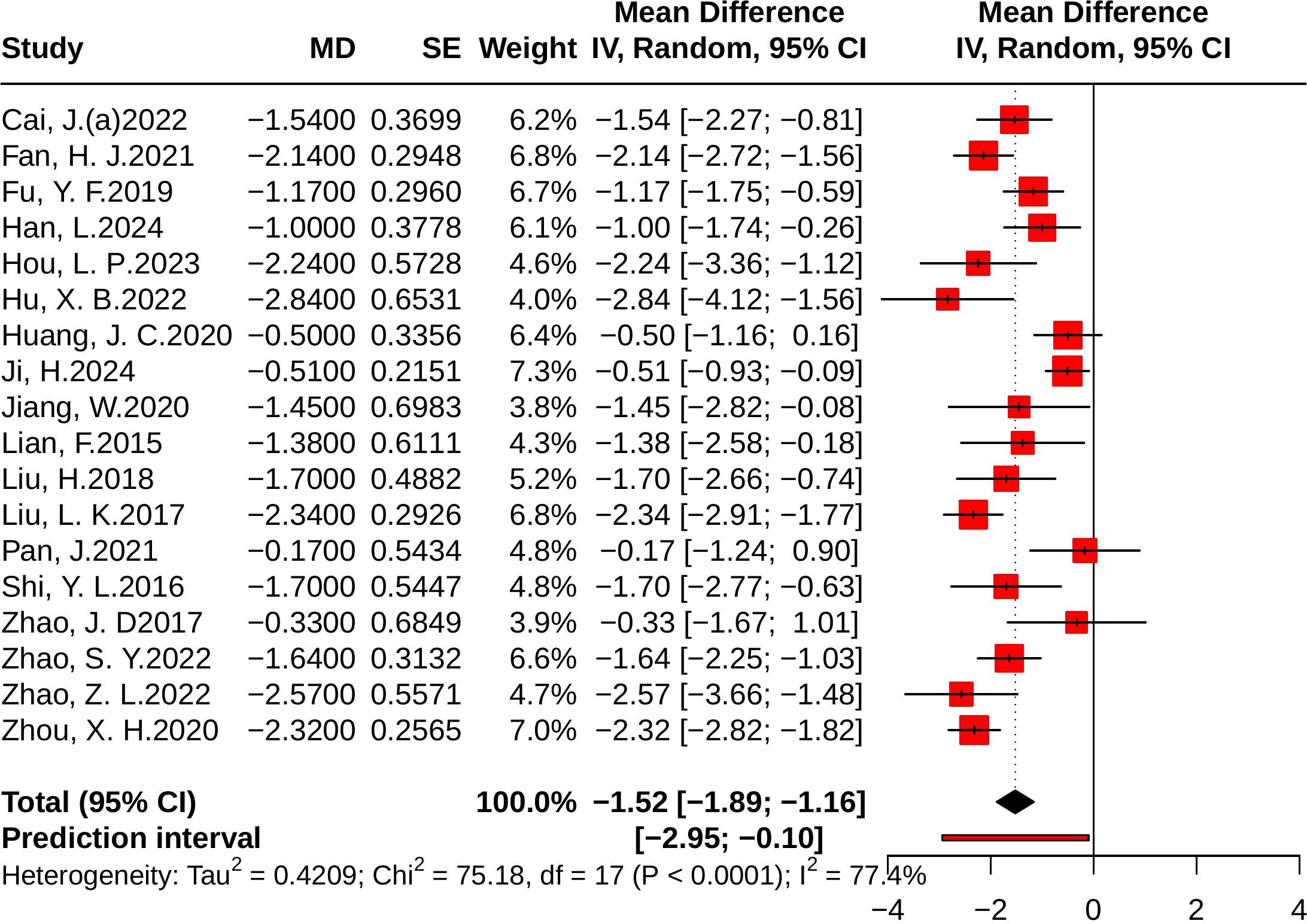 A total of 18 studies evaluated 2h-PG, with a combined sample size of 2,781 participants, including 1,391 in the control group and 1,390 in the treatment group. Heterogeneity testing revealed moderate heterogeneity among the studies (p < 0.001, I2 = 77.4%, 95% PI [-2.95, -0.10]). The meta-analysis showed that JLD significantly reduced 2h-PG levels (MD = -1.52, 95% CI: -1.89 to -1.16; p < 0.001), as shown in Figure 5.