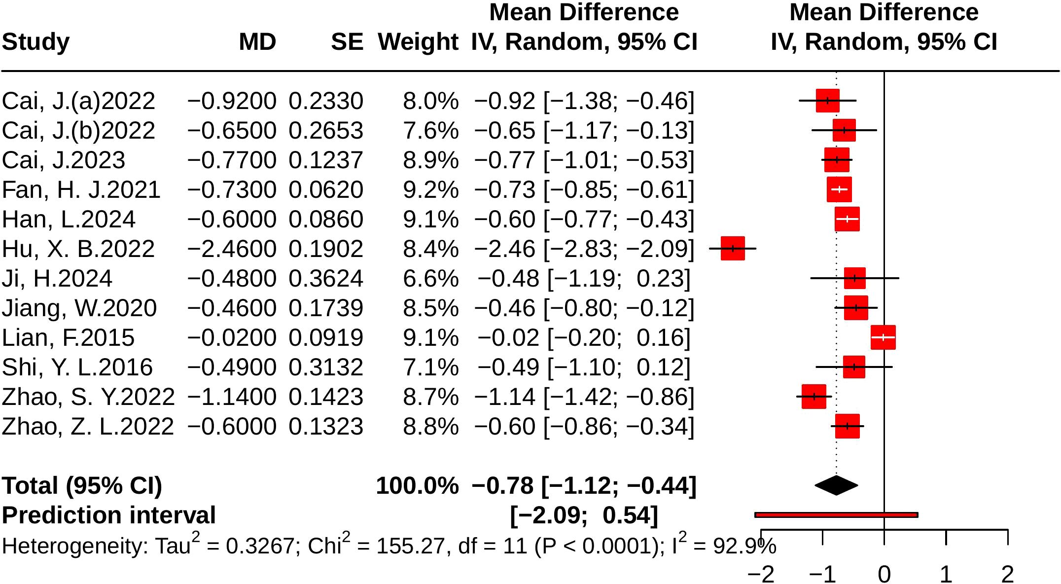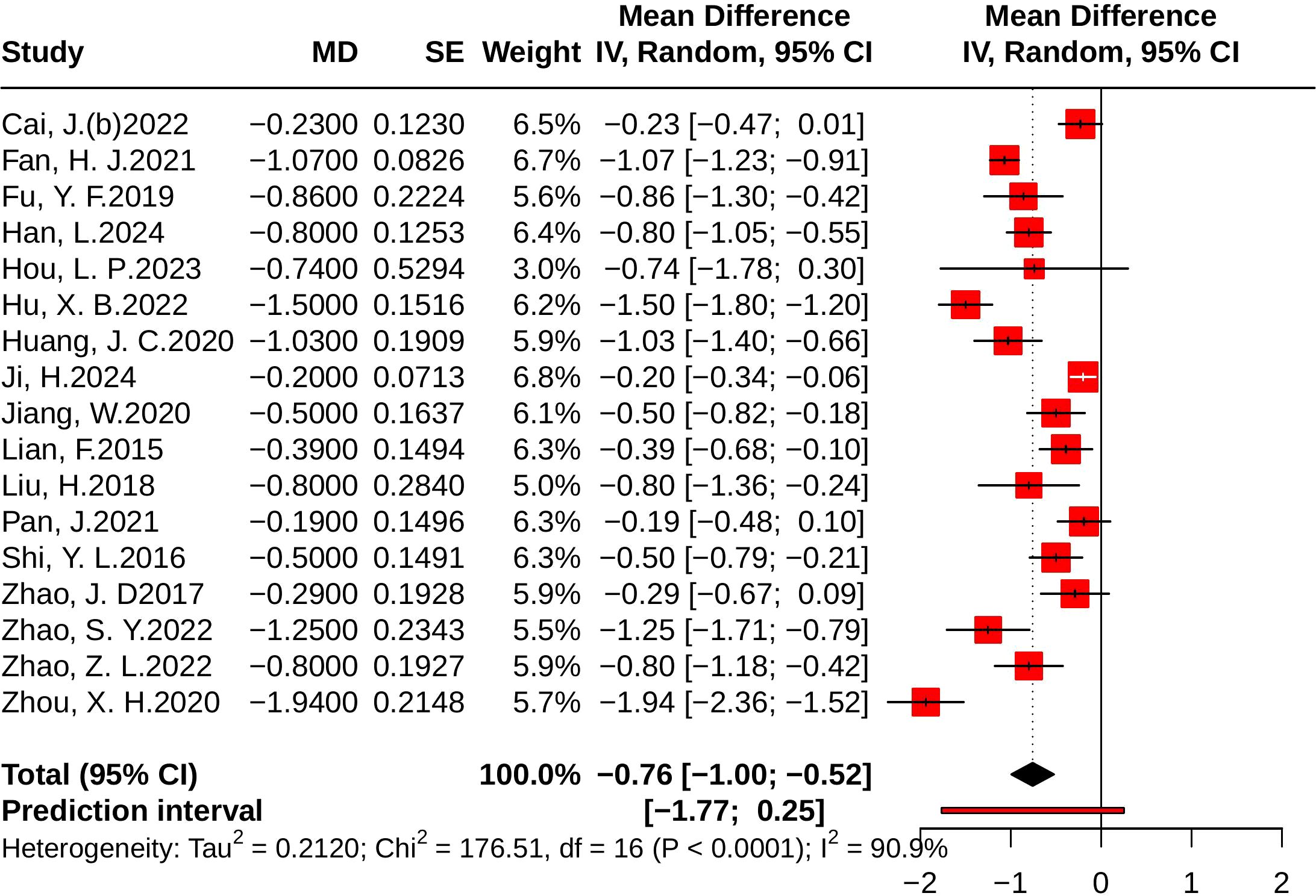 A total of 17 studies evaluated HbA1c, involving 2,683 participants—1,343 in the control group and 1,340 in the treatment group. Heterogeneity analysis revealed substantial heterogeneity among the included studies (p < 0.001, I2 = 90.9%, 95% PI [-1.77, 0.25]). The results of the meta-analysis showed that compared with the control group, JLD could significantly reduce 2h-PG levels (MD = -0.76, 95% CI: -1.00 to -0.52; p < 0.001), as illustrated in Figure 6.