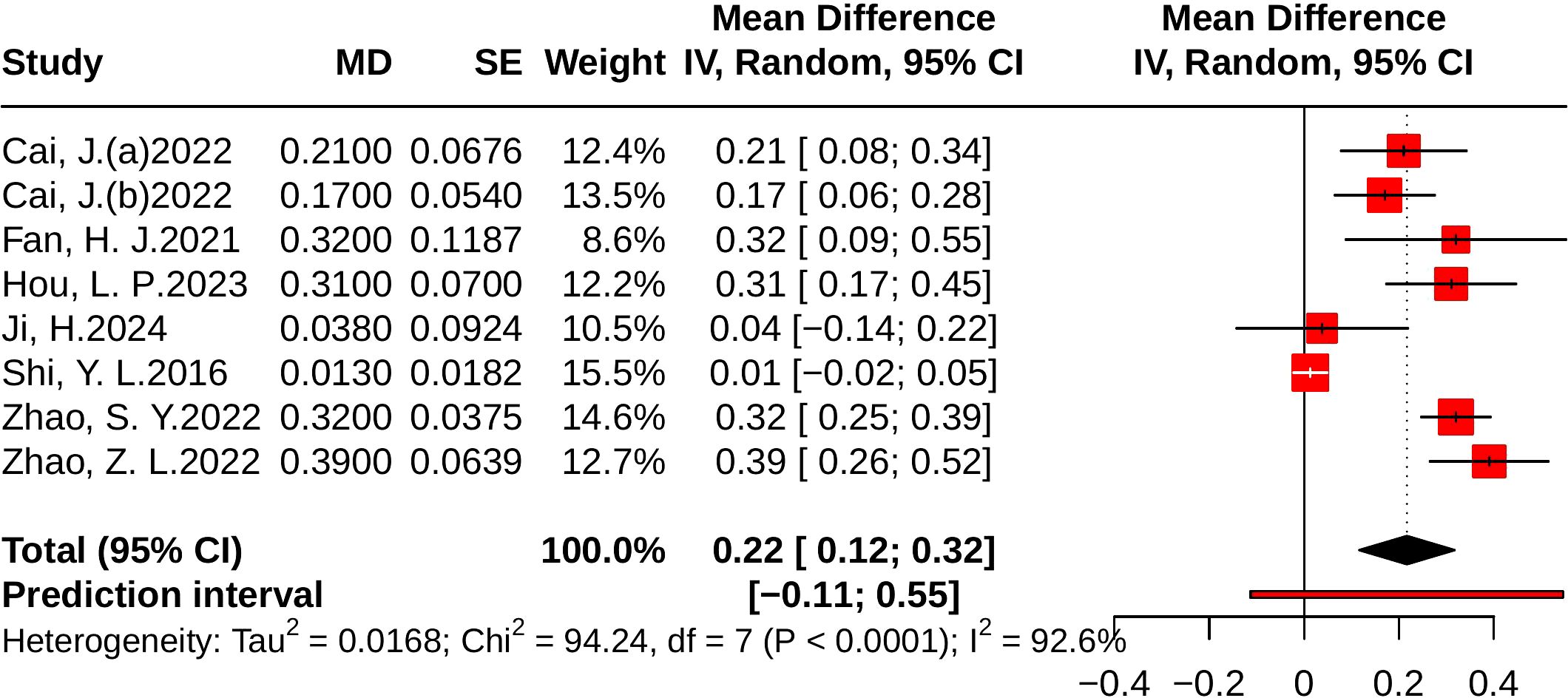 Eight studies evaluated HDL-C, including 1,442 participants (723 in the control group and 719 in the treatment group). Heterogeneity analysis revealed substantial between-study heterogeneity (p < 0.001, I² = 92.6%, 95% PI [-0.11, 0.55]). The meta-analysis demonstrated that JLD significantly increased HDL-C levels compared with the control group (MD = 0.22, 95% CI: 0.12 to 0.32; p < 0.001), as shown in Figure 8.