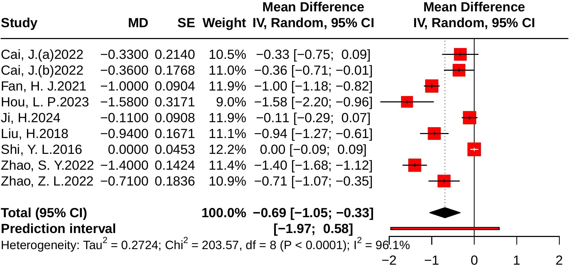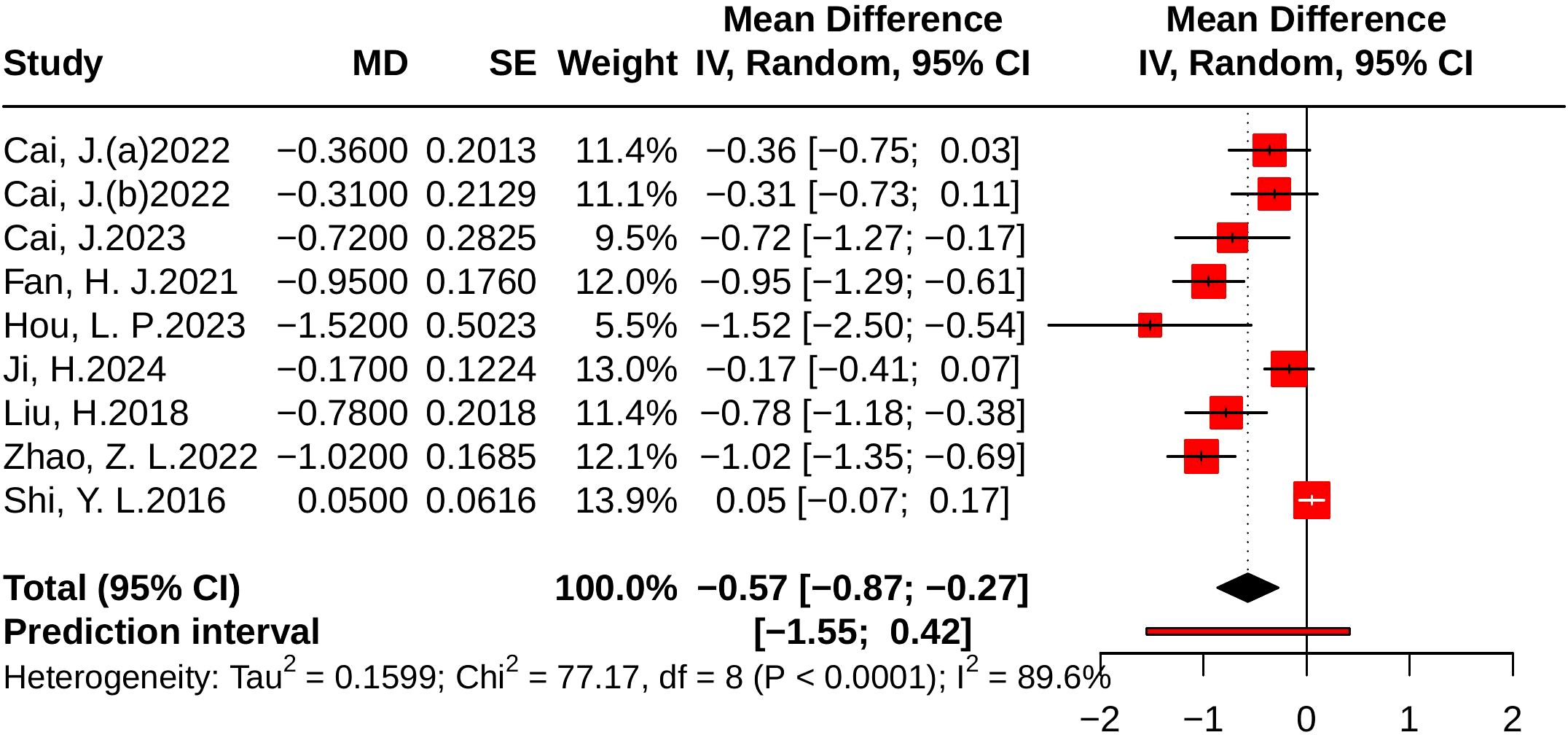 Nine studies evaluated TC, including 810 in the control group and 814 in the treatment group. Heterogeneity analysis indicated substantial variability (p < 0.001, I² = 89.6%, 95% PI [-1.55, 0.42]). The results of the meta-analysis showed that compared with the control group, JLD significantly reduced TC (MD = -0.57, 95% CI: -0.87 to -0.27; p < 0.001). The corresponding forest plot is presented in Figure 10.