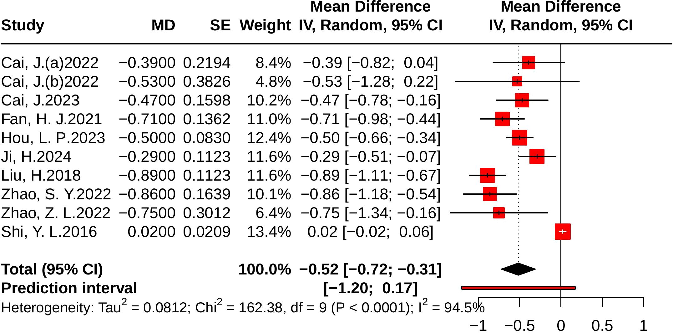 Ten studies evaluated TG, including 849 participants in the control group and 845 in the treatment group. Heterogeneity analysis revealed substantial heterogeneity (p < 0.001, I² = 94.5%, 95% PI [-1.20, 0.17]). The meta-analysis showed that, compared with the control group, JLD significantly reduced TG levels (MD = -0.52, 95% CI: -0.72 to -0.31; p < 0.001), as shown in Figure 11.