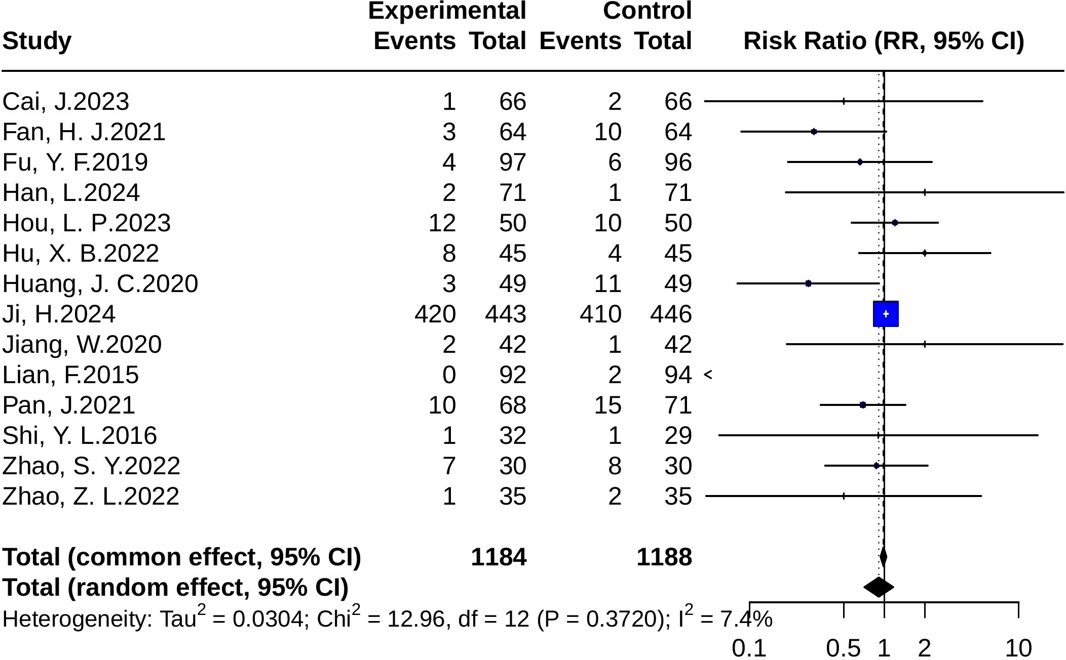 In the safety analysis, a total of 14 randomized controlled trials were included. The pooled results from the random-effects model showed no significant difference in the incidence of adverse events between the intervention and control groups (RR = 0.91, 95% CI: 0.71–1.17; p = 0.467). The heterogeneity test indicated p = 0.37 and I² = 7.4%, suggesting low between-study heterogeneity, as illustrated in Figure 12.
