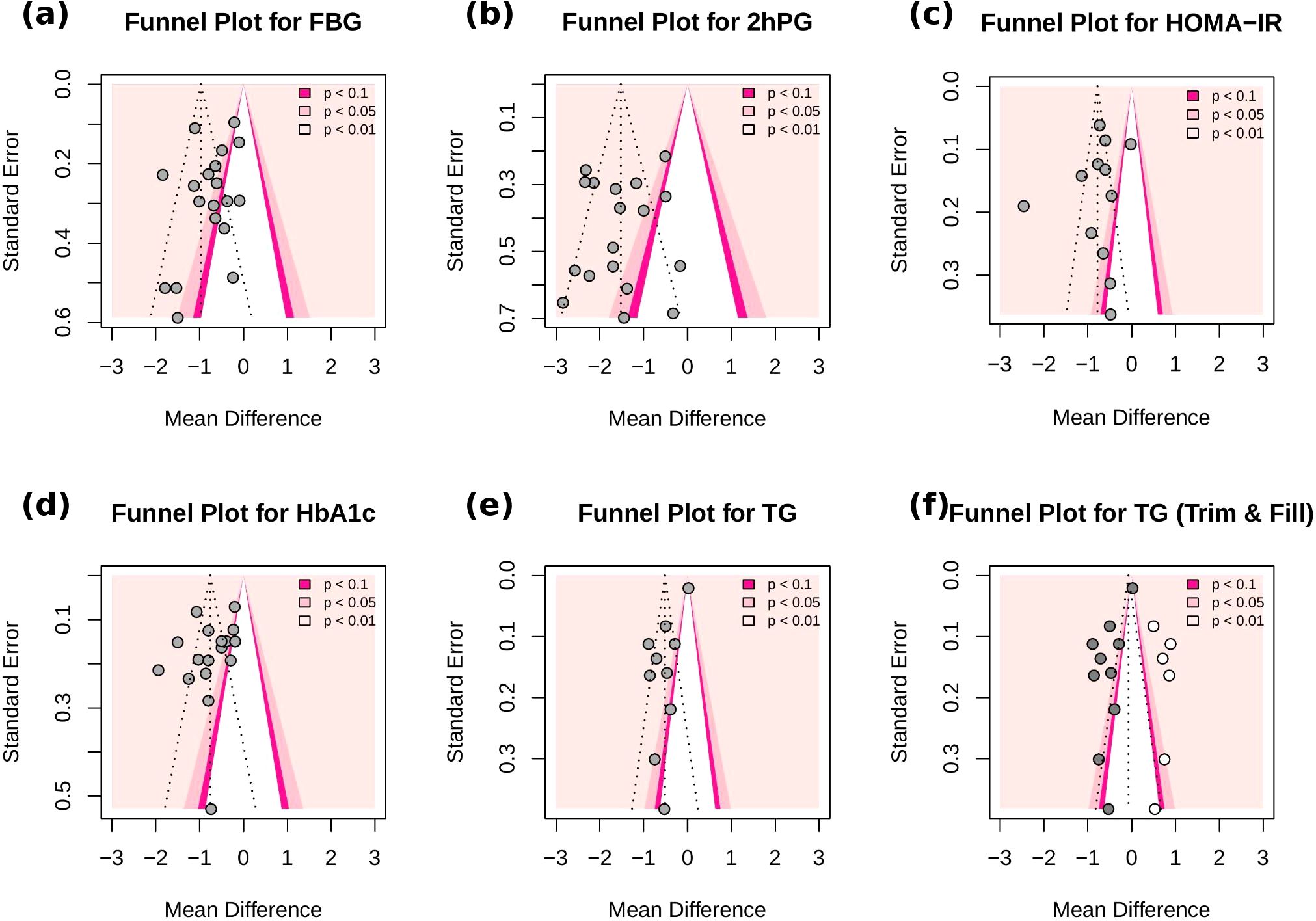 Figure 13. Funnel plots for (a) FBG, (b) 2h-PG, (c) HOMA-IR, (d) HbA1c, (e) TG (f) TG (Trim-and-fill). Each dot represents a study included in the meta-analysis. The vertical line denotes the pooled effect size, and the diagonal dashed lines represent the expected 95% confidence intervals around the effect. Grey dots correspond to the original studies, while white dots indicate imputed studies added by the trim-and-fill method.