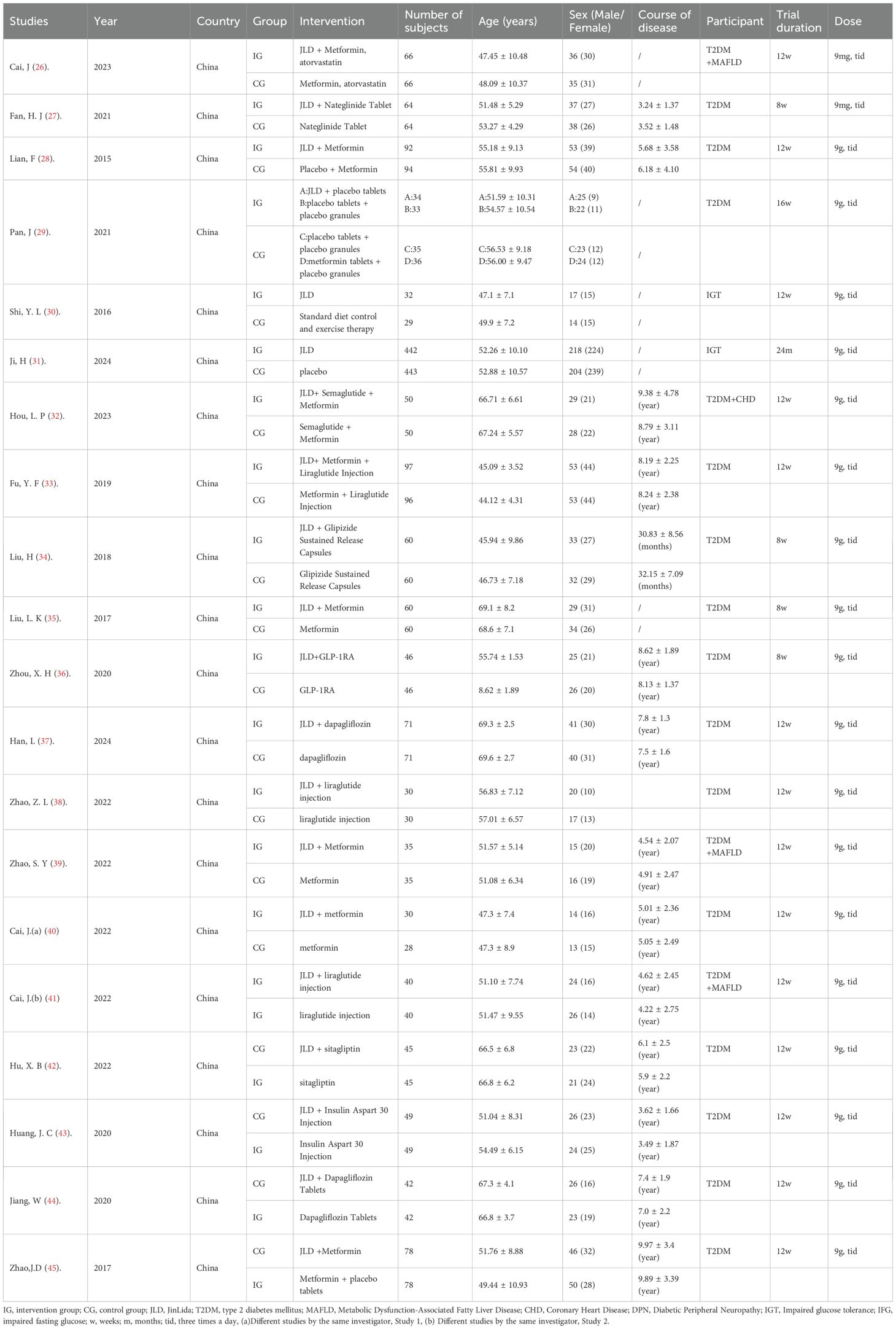 A total of 20 trials involving 2,993 subjects were included in this meta-analysis. These RCTs were published between 2015 and 2024. All studies were conducted in China. Of these, six were published in English and fourteen in Chinese. In two studies, the participants had PD, while in the remaining studies, participants had T2DM. Sample sizes ranged from 58 to 885. The duration of the intervention ranged from 4 weeks to 16 weeks. The average age of participants ranged from (44.12 ± 4.31) to (69.6 ± 2.7) years. The characteristics of the included trials are summarized in Table 1.