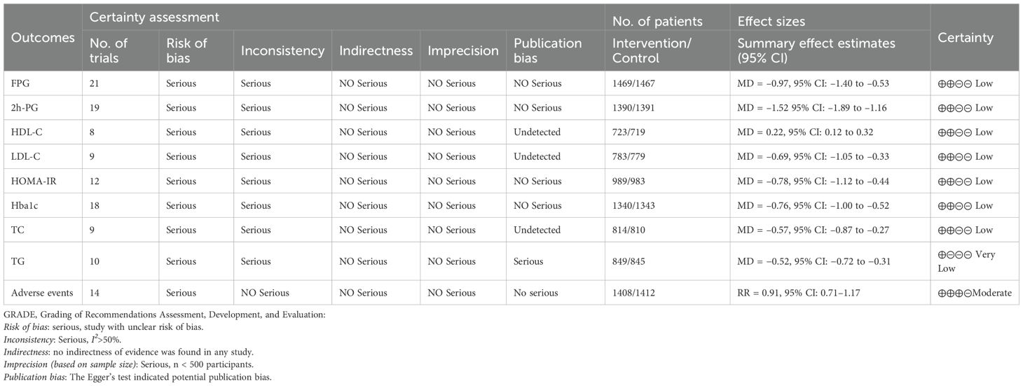 The GRADE assessment indicated that, due to risk of bias and inconsistency across the included studies, the overall certainty of evidence was rated as low for most outcomes, including FPG, 2h-PG, HDL-C, LDL-C, HOMA-IR, HbA1c, and TC. In addition, the certainty of evidence for TG was downgraded further to very low because of the combined influence of risk of bias, inconsistency, and potential publication bias. Detailed explanations of the ratings and reasons for downgrading are summarized in Table 2.