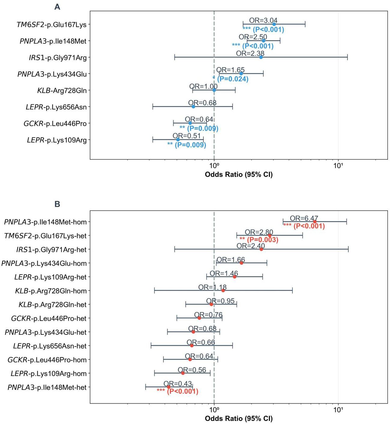 2. TM6SF2-Glu167Lys: A dominant model was used. This was represented by a dummy variable comparing carriers of at least one risk allele (CT + TT) against wild-type homozygotes (CC).