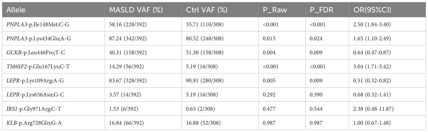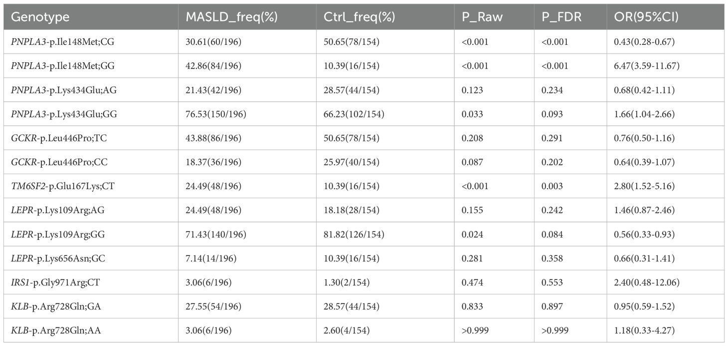 In contrast, the variant allele frequencies of GCKR-Leu446Pro and LEPR-Lys109Arg were significantly lower in the MASLD group than in the control group (GCKR-p.Leu446Pro; T-C: P_FDR=0.009, OR = 0.64; LEPR-p.Lys109Arg; A-G: P_FDR=0.009, OR = 0.51). This implies that the variant sites of these two SNPs may serve as protective variants against MASLD, and individuals with the wild-type of these SNPs have a higher risk of developing MASLD.