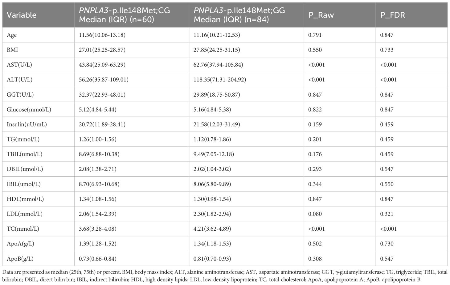 Differences in biochemical indicators between PNPLA3-p.Ile148Met CG/GG genotypes were analyzed via Mann–Whitney U test (due to non-normal distribution). To control for type I errors in multiple testing, we applied false discovery rate (FDR) correction using the Benjamini–Hochberg procedure with the following specific implementations: