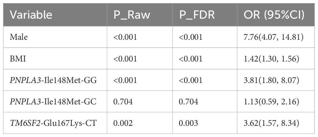 Multivariable logistic regression (with MASLD status as the dependent variable) was then employed to identify independent predictive factors, incorporating the pre-specified genetic models for PNPLA3-Ile148Met and TM6SF2-Glu167Lys, alongside covariates including age, sex, and BMI. Variable selection was performed using a stepwise method.