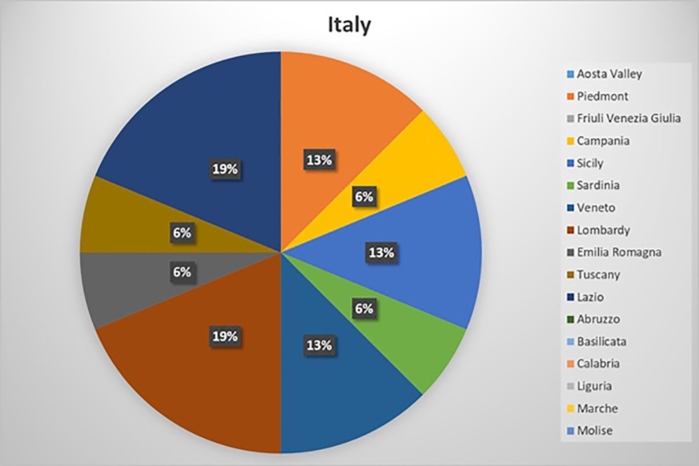 Pie chart titled “Italy” depicting different regions. Aosta Valley and Lombardy are the largest, each occupying 19% of the chart. Tuscany and Lazio each occupy 13%, while Friuli Venezia Giulia, Campania, Sardinia, Veneto, Emilia Romagna each represent 6%. Color legend identifies each region.