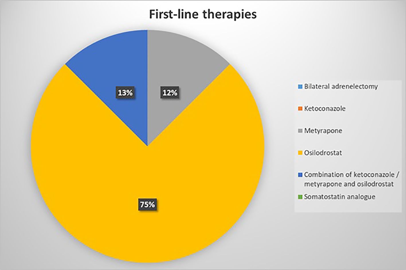Pie chart titled “First-line therapies” showing ketoconazole at 75% in yellow, combination of ketoconazole/metyrapone and osilodrostat at 13% in blue, and metyrapone at 12% in gray. Other therapies are listed but not represented.