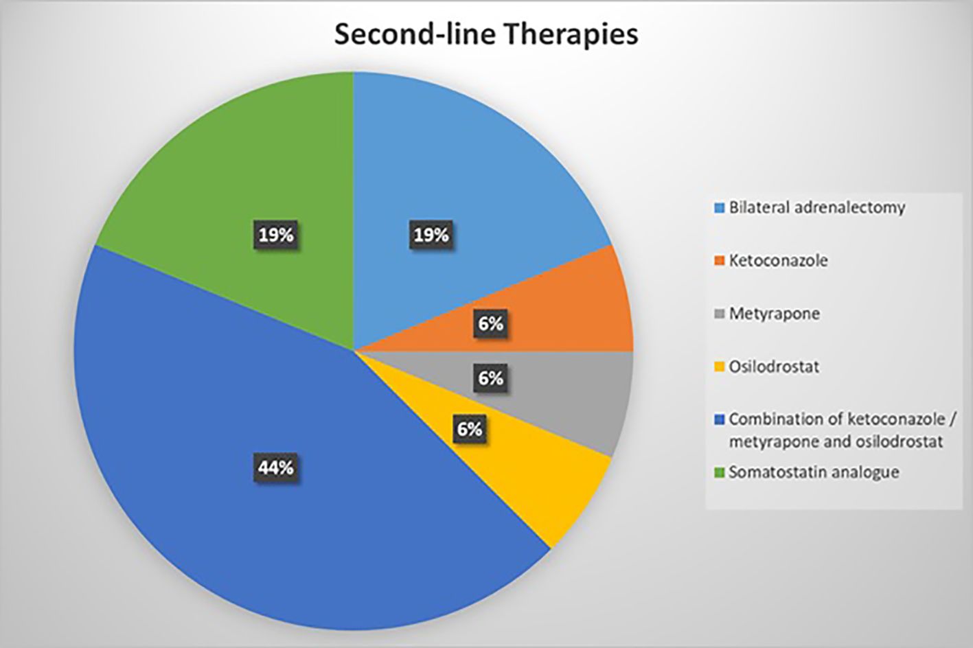 Pie chart titled “Second-line Therapies” shows the distribution of therapies. Combination of ketoconazole/metyrapone and osilodrostat is 44%, somatostatin analogue 19%, bilateral adrenalectomy 19%, ketoconazole 6%, metyrapone 6%, osilodrostat 6%.