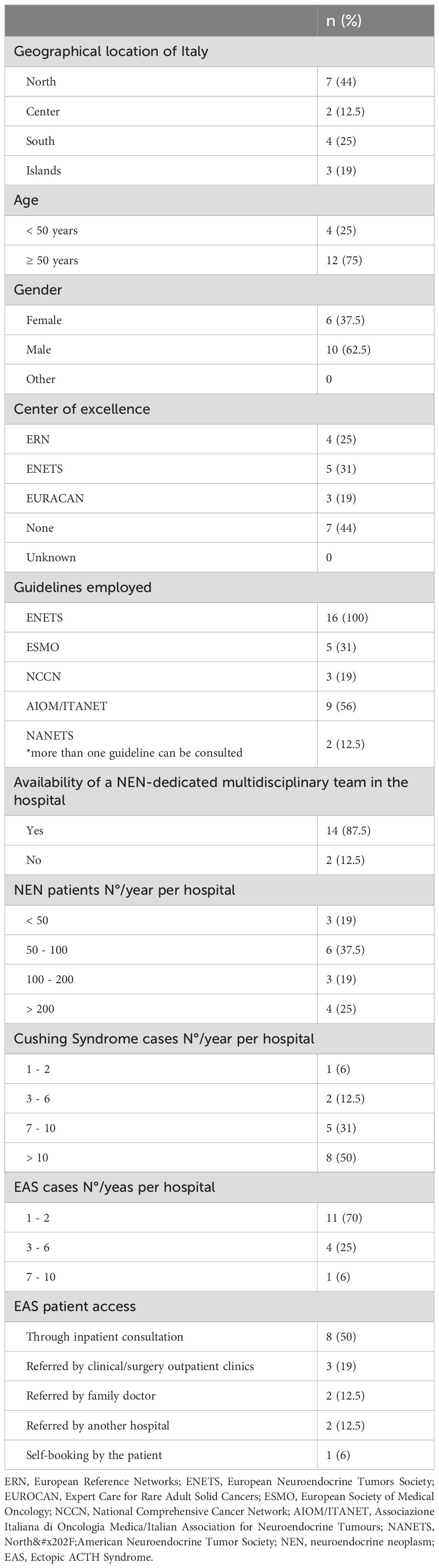Answers from a total of 16 out 26 centers with expertise in NEN and EAS fields working in hospitals throughout Italy have been received and collected. Q1-Q18 collected details about general features of the respondents. Table 1 summarizes these characteristics.