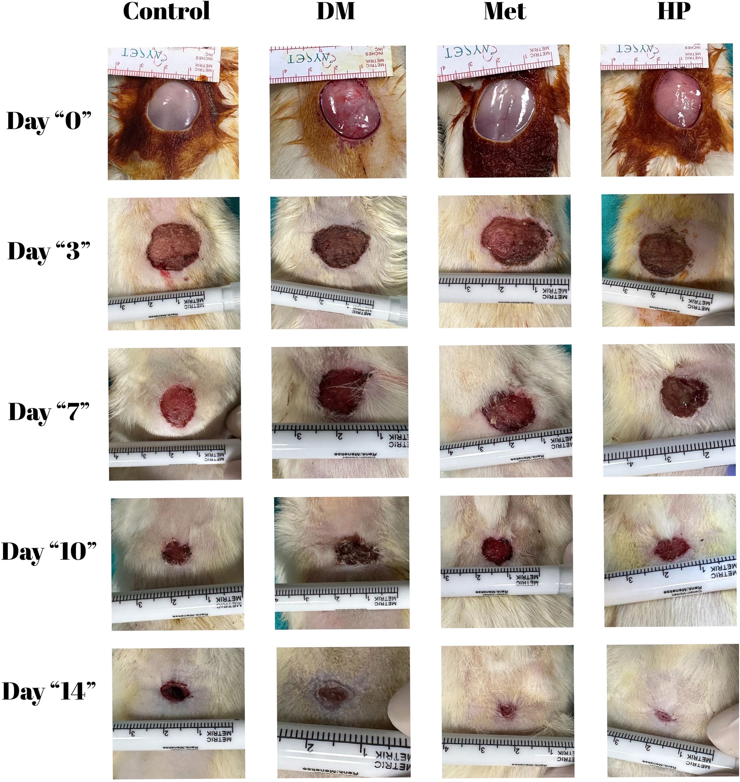 Conclusion: Topically applied HP in uncontrolled DM rats improved wound healing scores more than the non-diabetic controls. Metformin also significantly enhanced healing in DM rats, with results comparable to controls. Since HP and metformin are easily accessible, further research could lead to cost-effective treatments for wound healing issues in DM patients.