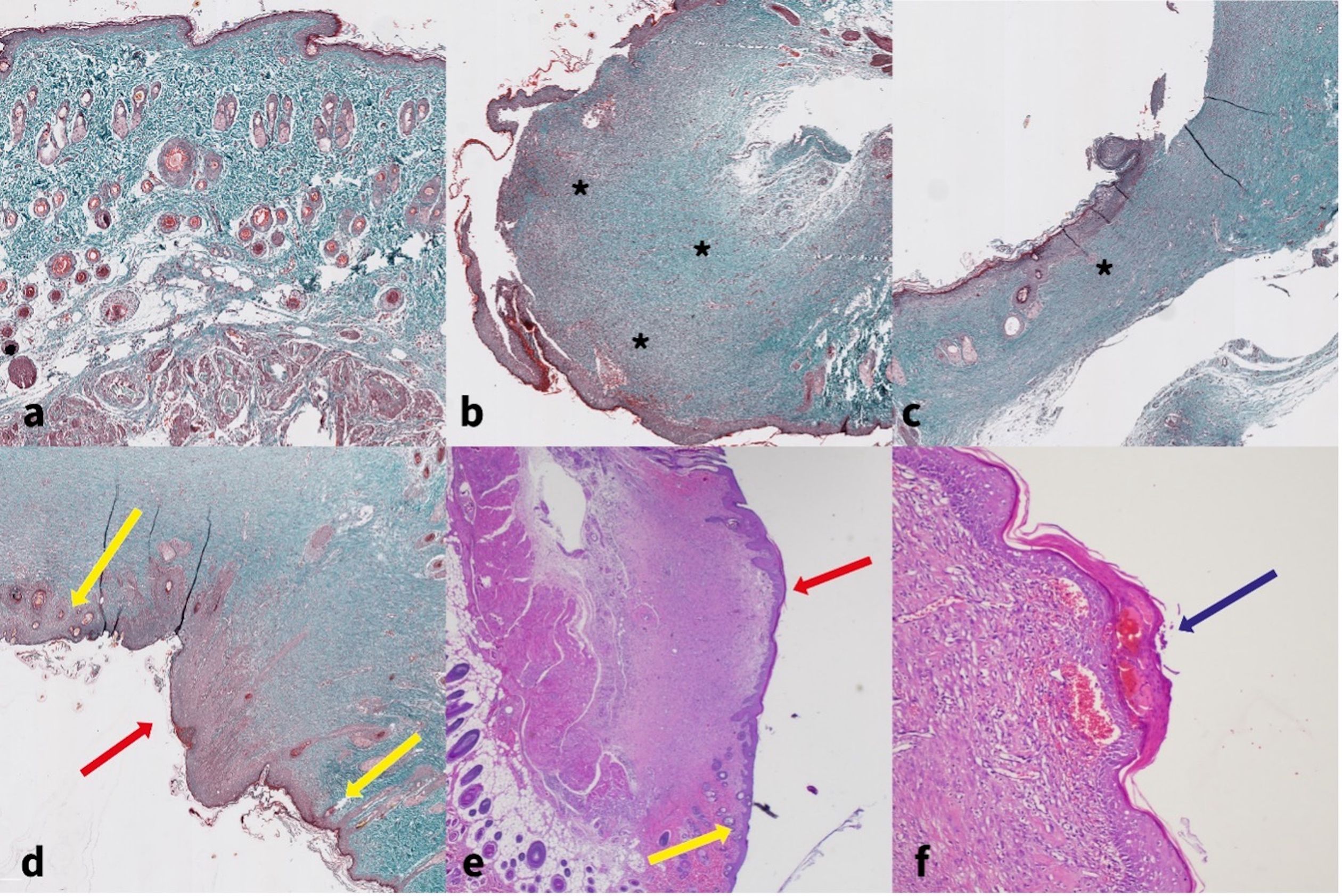 Figure 2. (a) Normal skin with preserved skin appendages, Masson’s Trichrome Staining. (b) Hypertrophic scar tissue (black asterisk) with incomplete epidermal reepithelialization. The epidermis appears mildly thickened compared to uninjured skin, Masson’s Trichrome Staining. (c) Hypoplastic scar tissue compared to uninjured skin, with incomplete reepithelization on the wounded epidermis, Masson’s Trichrome Staining. (d) Thickened, complete epidermis over scar tissue (red arrow) compared to normal skin epidermis (yellow arrow). (e) Nearly normal thickness of epidermis over hypertrophic scar tissue, H&E, 40x. (f) Parakeratotic hyperkeratosis over completely healed epidermis, H&E x100.