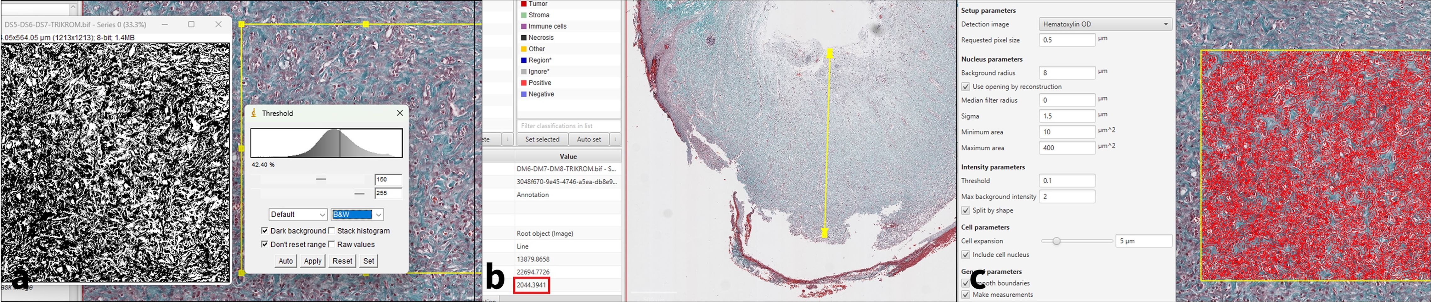 Figure 3. (a) Measuring collagen index with threshold function on ImageJ software. (b) Measuring scar tissue thickness and hypertrophic index on scanned image using Masson’s Trichrome staining. (c) Measuring fibroblast count on digital scanned image using QuPath software.