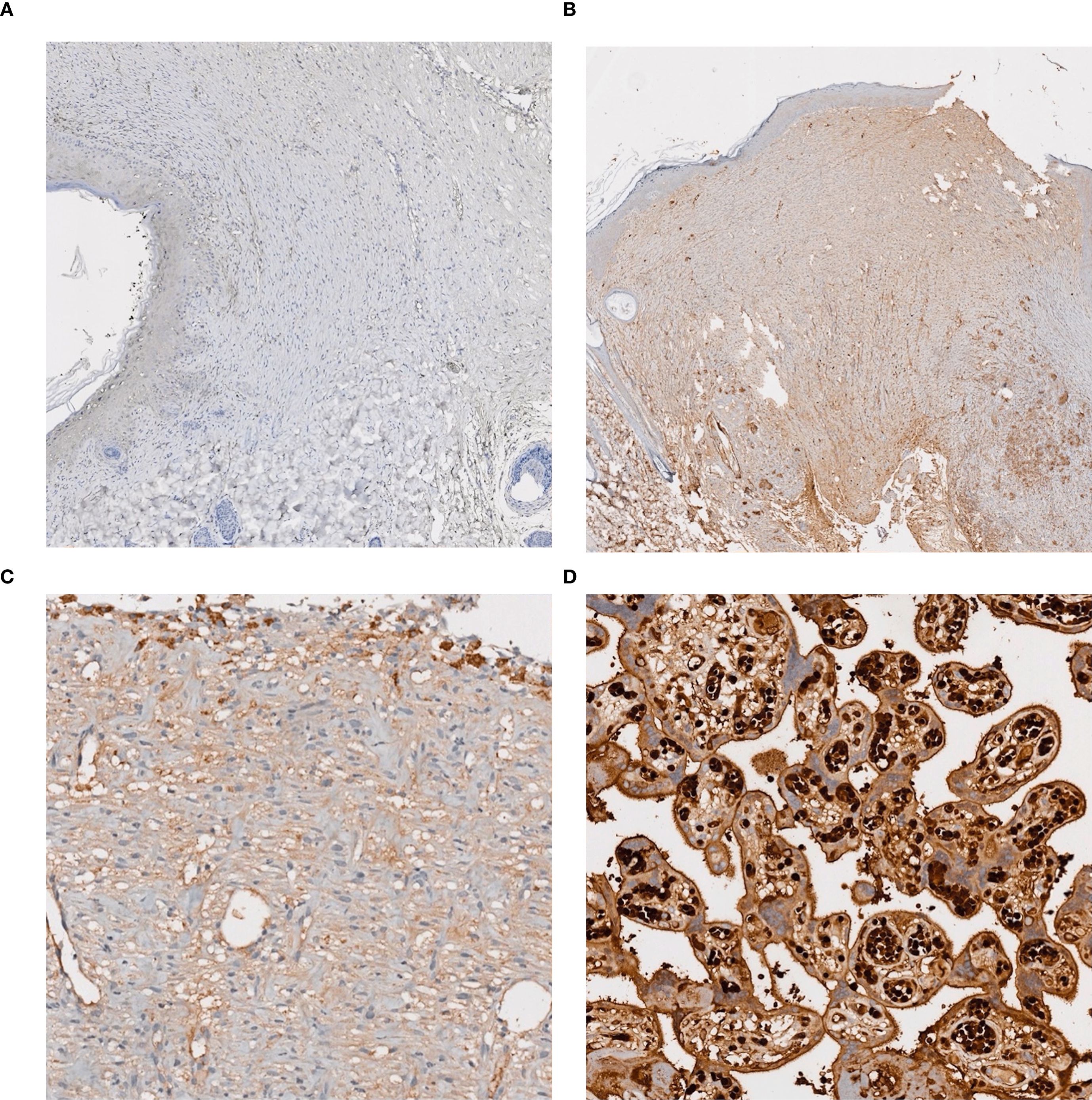 Figure 4. Representative immunohistochemical staining with TGF-β1. (a) Mostly negative expression with TGFβ1 in scar tissue, (b) Weak but diffuse staining with TGFβ1 in scar tissue, scanned image, low power field view, (c) Weak but diffuse staining with TGFβ1 in scar tissue, scanned image, high power field view, (d) Staining of TGFβ1 in placental control tissue.
