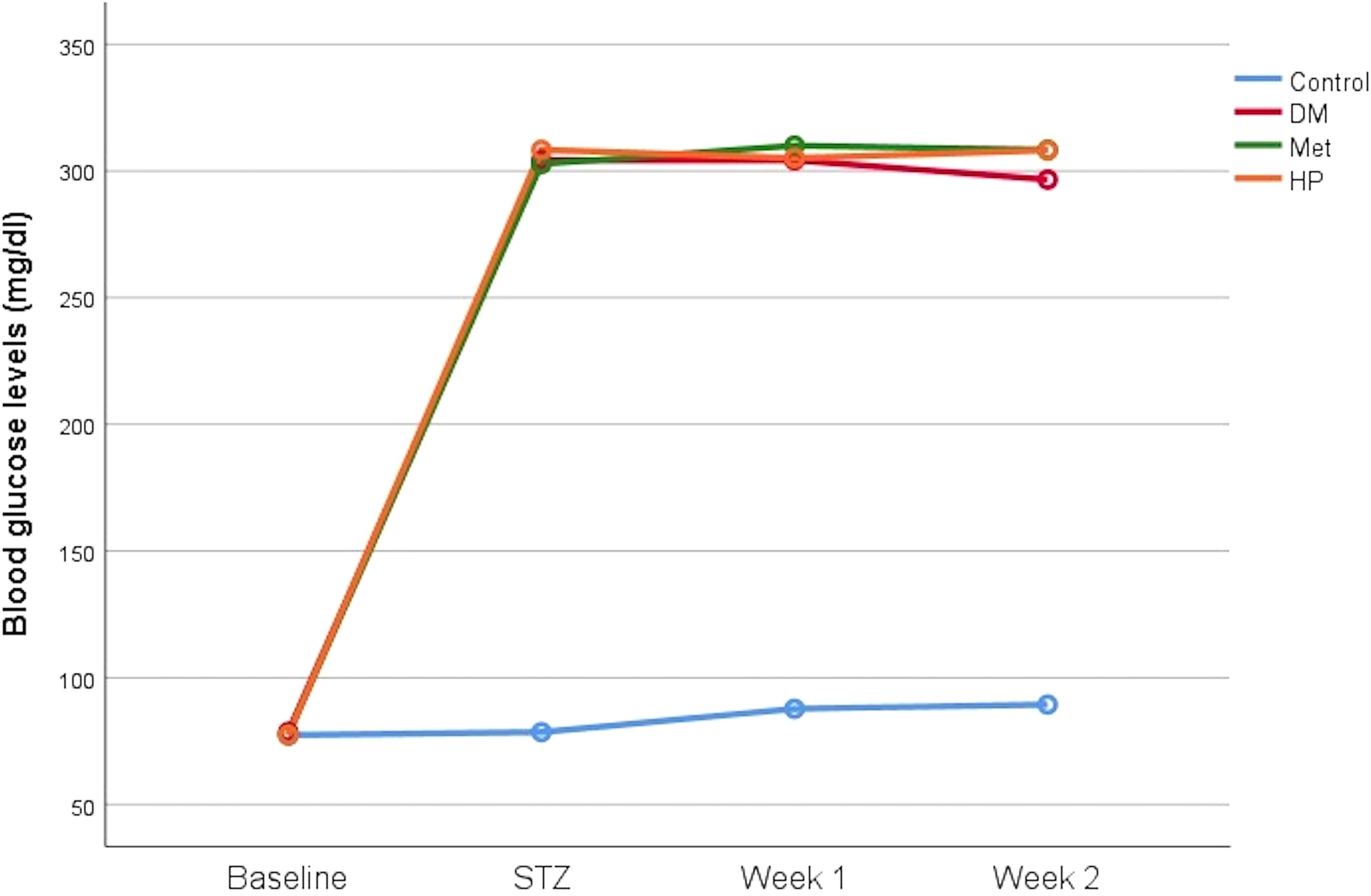 Analysis of blood glucose levels before and during treatment revealed significant differences between the control group and the diabetic groups induced by STZ (p<0.001). All three DM-induced groups showed significant increases after STZ injection, as indicated by the comparison of pre- and post-injection values. However, there were no statistically significant differences between the DM, Met, and HP groups after the STZ injection (p>0.05). Even the control group, which did not receive STZ, experienced significant increases in blood glucose levels during the first and second weeks of treatment (p< 0.05) (Table 2, Figure 5).