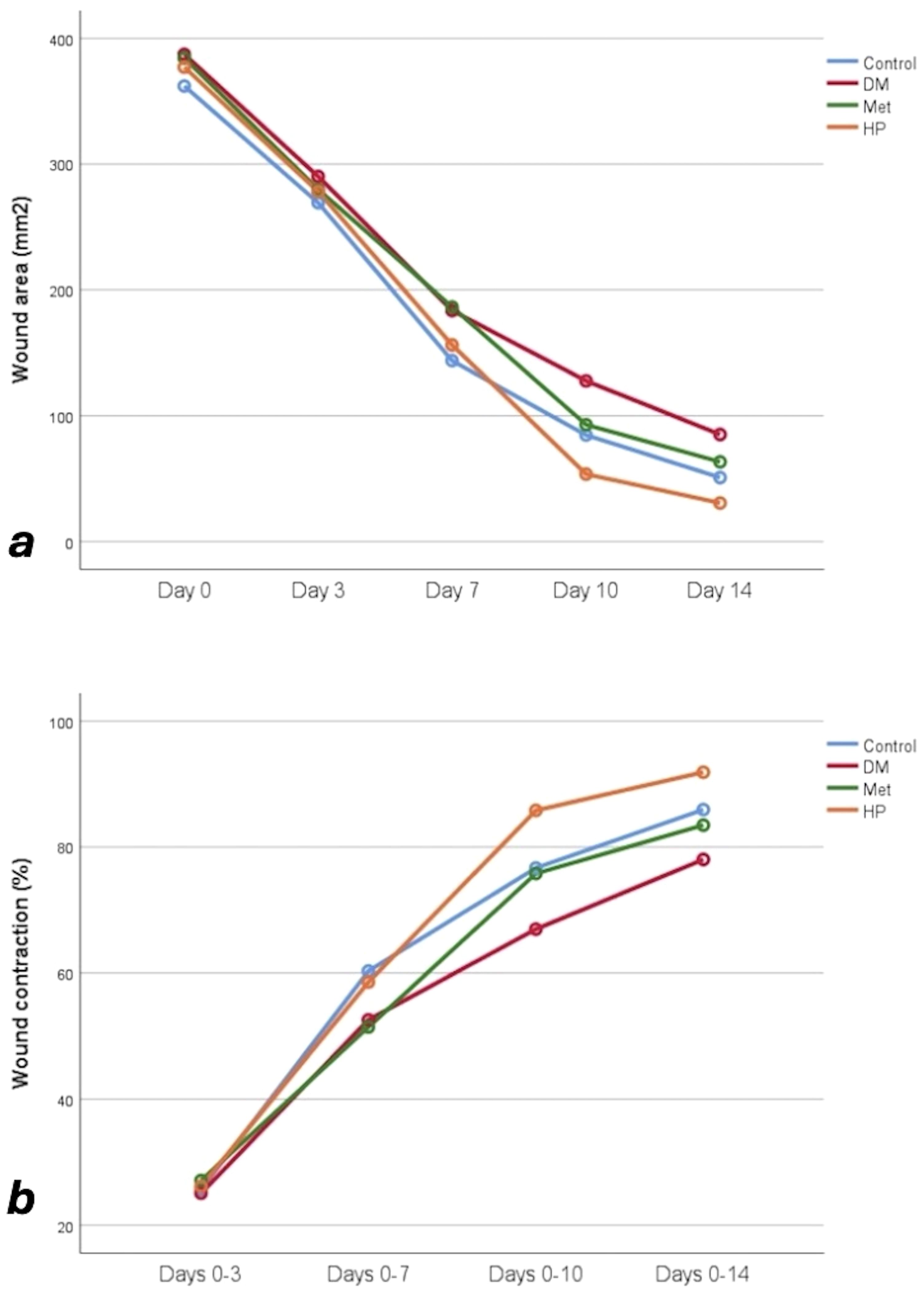 The wound size measurements across the groups showed significant changes during the study period; all groups experienced notable reductions from day 0 to 14 (p<0.001). On day 3, the DM group had the largest wound size (p=0.030). By day 7, the control group had the smallest wound size, followed by the HP group (p<0.001). On day 10, the HP group had the smallest wound size, while the DM group had the largest (p<0.001). Finally, on day 14, all groups demonstrated significant differences; the HP group had the smallest wound size, and the DM group had the largest (p<0.001) (Table 4, Figure 6a).