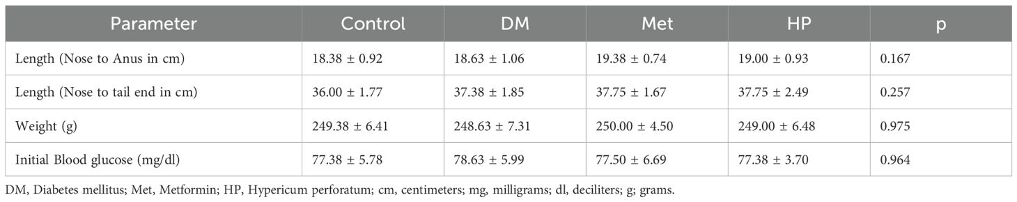 The baseline characteristics of the rats prior to the study revealed no significant differences between the groups; on day 0, all rats exhibited similar blood glucose levels, lengths, and weights (p > 0.05). The distribution of these measurements before the study is detailed in Table 1.