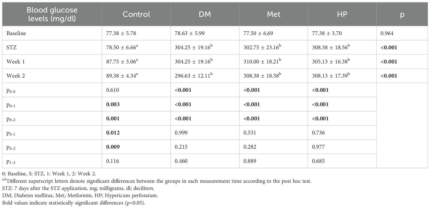Statistically significant increases in blood glucose levels were observed in all three groups (DM, met, HP) after STZ administration. Although STZ was not given, the rise in blood glucose in the control group was not considered to be within diabetic limits and was thought to be related to surgical stress, which aligns with the literature (34).