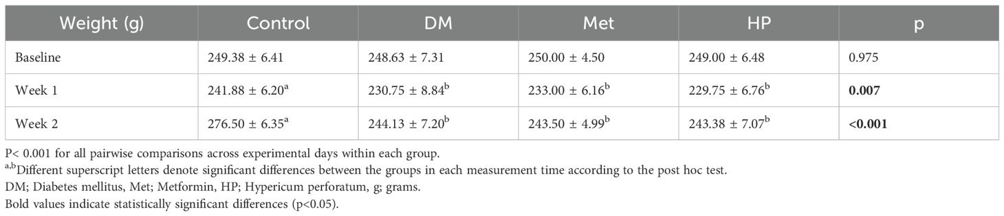 Throughout the study, the diabetic groups consistently weighed less than the control group during the first and second weeks (p=0.007 and p<0.001, respectively). In the control group, weight declined during the first week of treatment and then increased by the end of the second week (p<0.001). Conversely, in the three diabetic groups, weight also decreased initially. Then it increased in the second week, but these weights remained lower than those of the control group (p<0.001) (Table 3).