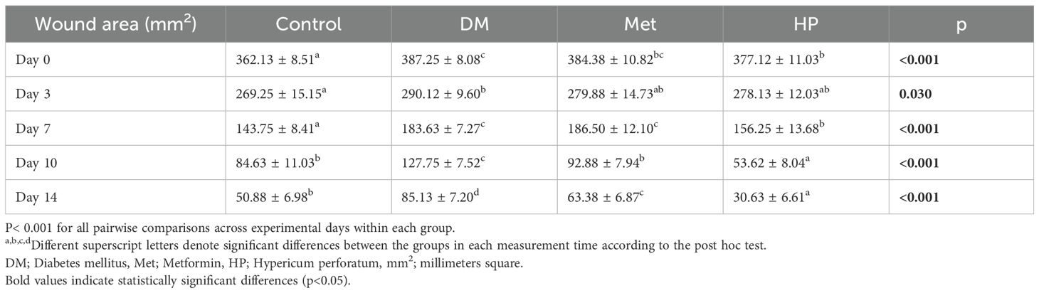 Our study has certain limitations. First, the small sample size was limited by ethical considerations. Additionally, a 14-day assessment of wound healing only captures the initial phase of tissue remodeling. Furthermore, the anatomical differences in skin structure between humans and rats mean that further research involving human subjects is necessary to confirm our findings. Moreover, additional studies are needed to thoroughly evaluate parameters such as the local absorption rate and the participation of systemic circulation in topically applied HP and metformin. The levels of hyperforin and hypericin in the Hypericum perforatum extract were not measured, which limits reproducibility due to lack of standardization. Also, our study does not fully reflect wound healing mechanisms, as molecular markers like vascular endothelial growth factors (VEGF), cytokines, and oxidative stress markers were not assessed. Future research focusing on these additional molecular parameters may offer more comprehensive insights into how HP and metformin contribute to wound healing. Furthermore, this study examined the effects of metformin and HP separately. Future studies exploring the potential synergistic effects of combining HP and metformin could lead to new treatment strategies for diabetic wound healing.