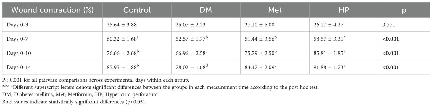 The wound contraction percentages from day 0 to 14 were statistically significant across all groups (p<0.001). There was no significant difference in wound contraction rates between the groups on days 0-3 (p = 0.771). On days 0-7, the control and the HP groups showed higher contraction rates compared to the DM and Met groups (p<0.001). On days 0-10, the HP group exhibited the highest contraction rate, while the DM group had the lowest (p<0.001). By day 0-14, all groups showed significant differences, with the highest contraction in the HP group and the weakest in the DM group (p<0.001) (Table 5, Figure 6b).